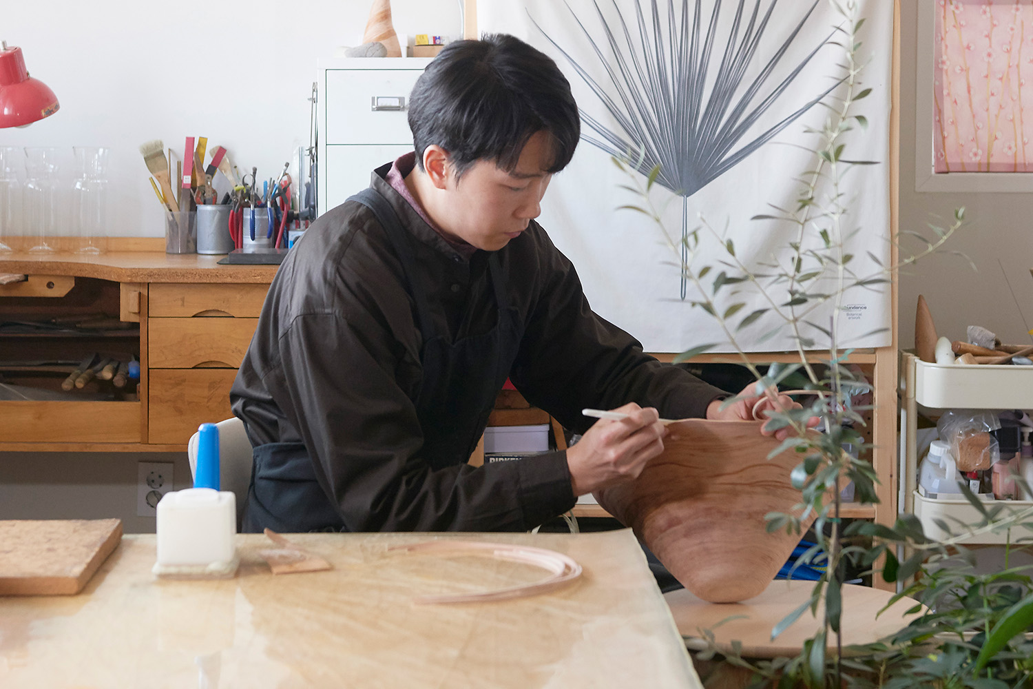 Junsu Kim originally studied metal work at university and graduate school, but became interested in the performance of leather. He took part in a leather workshop in Italy and has been working as a leather craftsman since graduation. After lots of research on how to craft with leather and transform it to make it look more interesting, he was able to present leather in a novel way. With this innovative approach Junsu has become a craftsman in his own field. His inspiration comes from what he observes: colours, structures and textures from plants in his atelier, or landscapes in new places. Junsu says, "The joy and sense of accomplishment from having made something with my own hands naturally led me to continue with this craft."