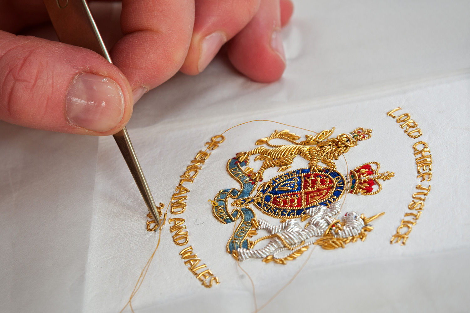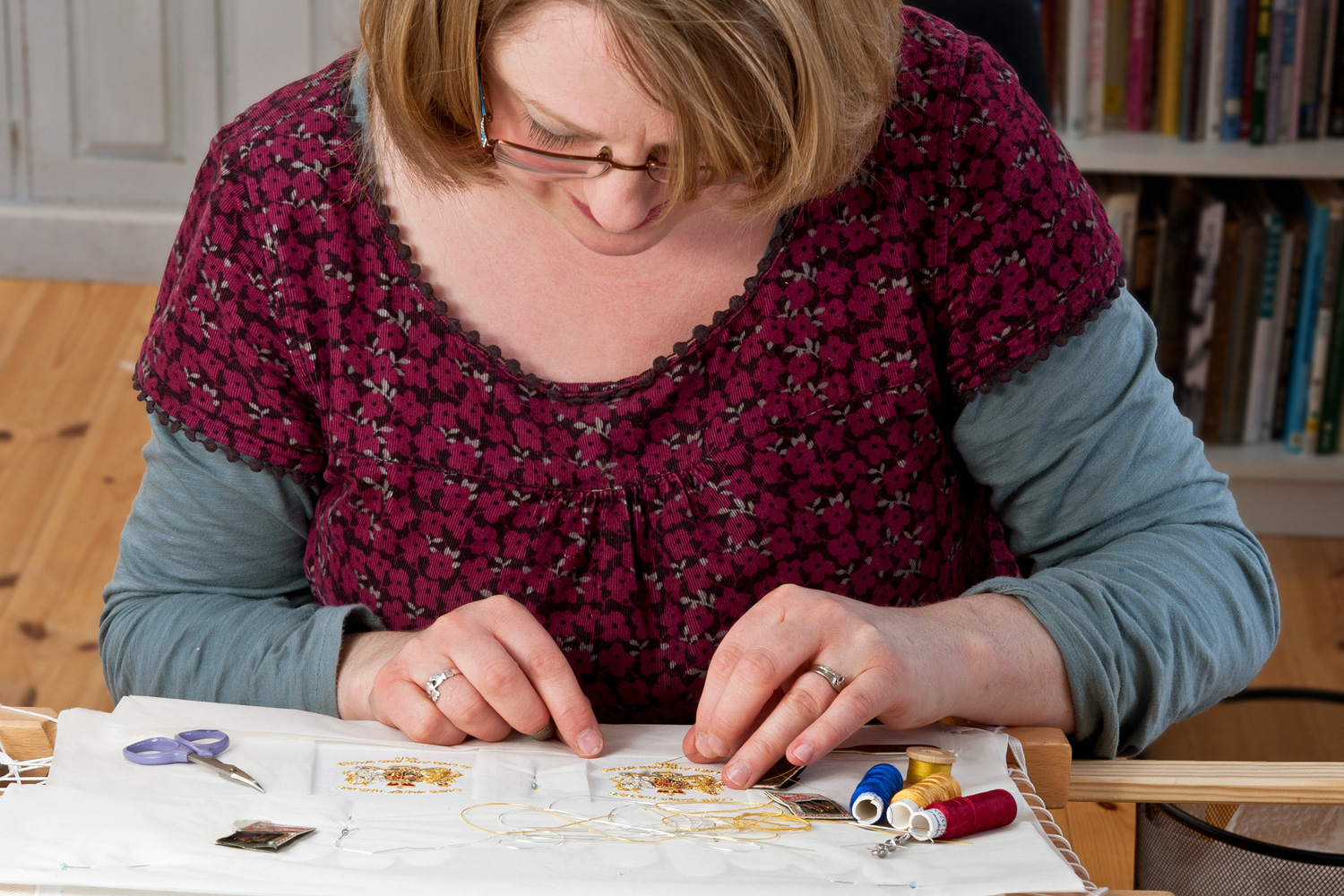 Jenny Adin-Christie's mother was a textile teacher at an elementary school and her father a master gunsmith who enjoyed richly detailed embellishments. At 18, Jenny enrolled in the Royal School of Needlework at Hampton Court Palace. At that time, the school ran a three-year apprenticeship, training a small group of embroiderers to an exceptionally high professional standard, that would allow them to work together seamlessly on commissions, incorporating all forms of hand-embroidery. To this day Jenny is called back to this group for major royal occasions such as for the wedding of HRH Princess of Wales and the Coronation of HM King Charles III. She remained at the RSN for a further ten years to teach new generations of apprentices and students. Only after her daughter was born in 2008 did she decide to pursue a career on her own, with a balance between teaching and working as an embroidery artist. Over the years, Jenny's self-employed business has grown into a highly successful off and online operation in which her entire family participates with great passion.