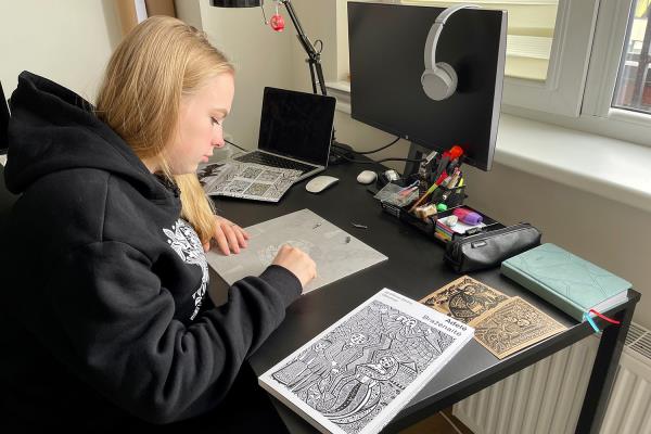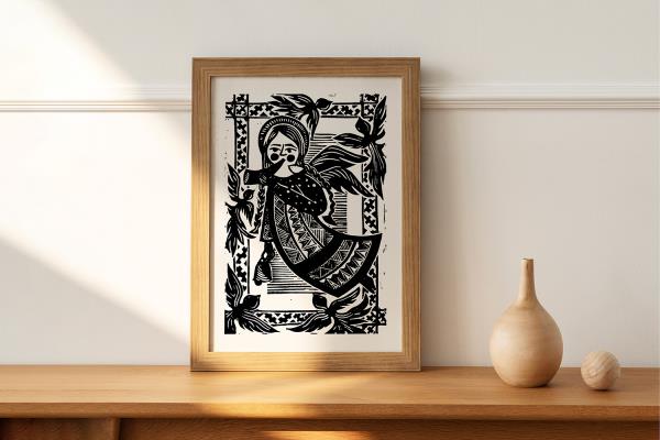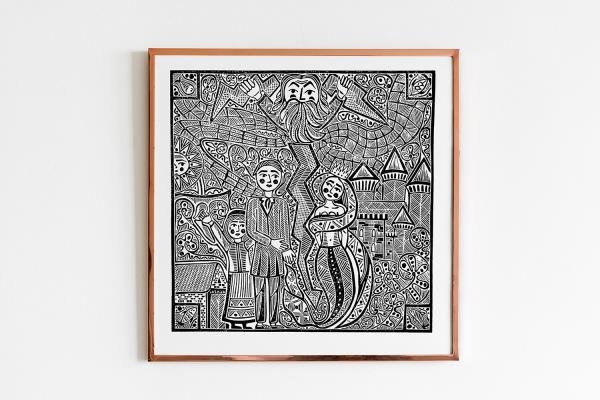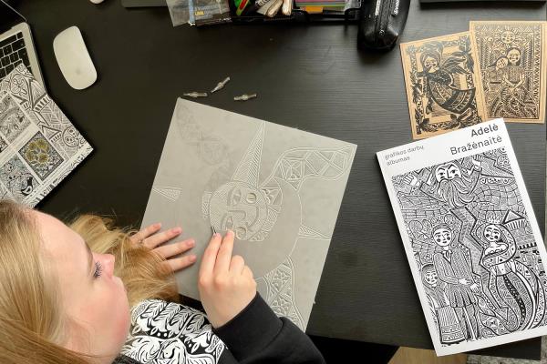 Adelė Gančierė has been surrounded by folk art since childhood: her mother is a famous paper-cutting artist, and many of her family members were involved in folk art. It was therefore a natural choice to pursue that folk art as a career. Adelė could talk for hours about woodcuts, linocuts, and their history. Having immersed herself in this art form as a teenager, she not only wrote her final thesis at university about woodcuts but also published a book. Her woodcuts and linocuts now travel to the farthest corners of the world and she regularly organises exhibitions and workshops, proving by example that folk art can find a place in modern everyday life. Her cuttings are inspired by Lithuanian folk songs and fairy tales, combining traditional forms with contemporary presentations.