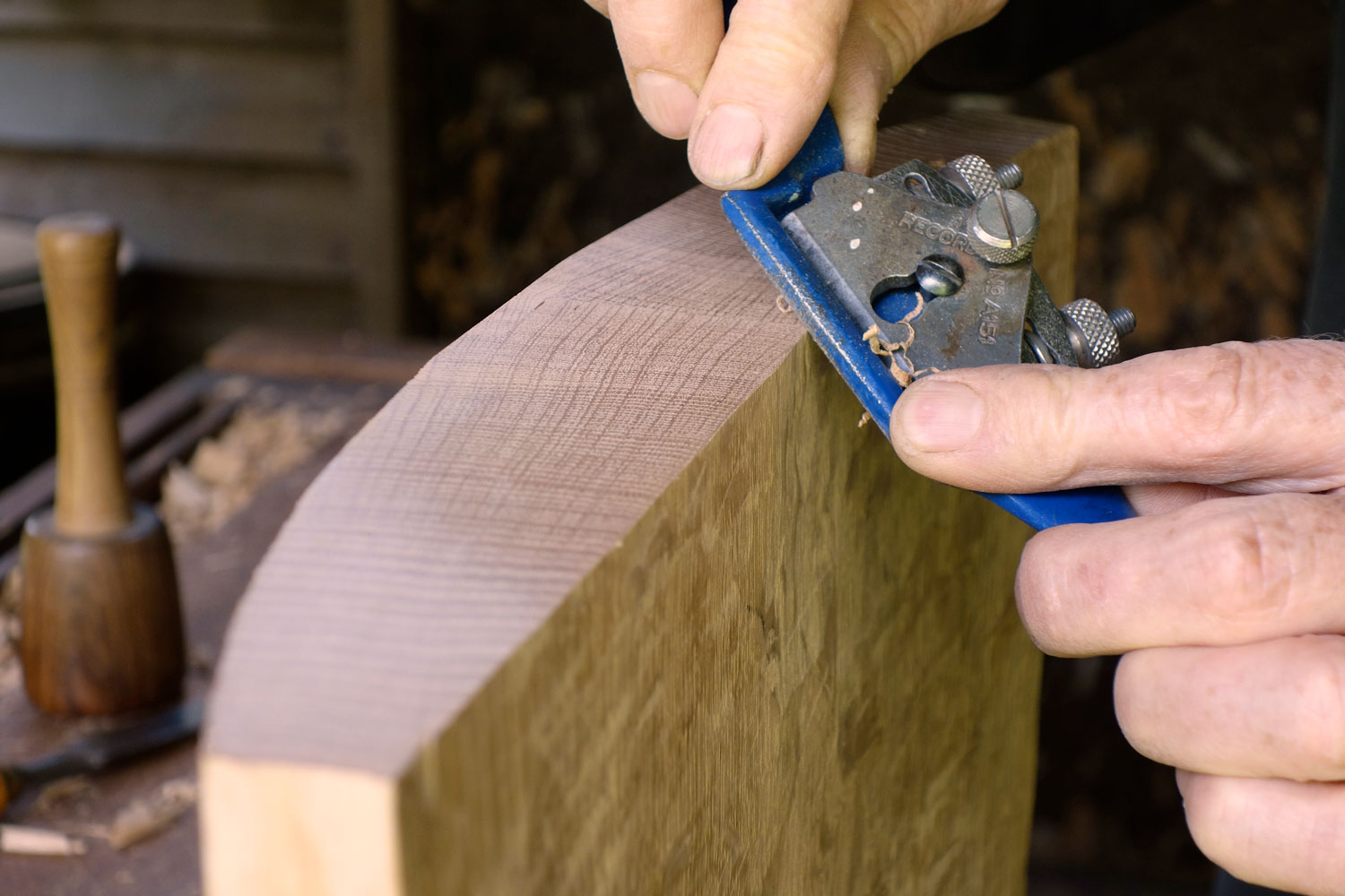 Adrian McCurdy is an artist with a deep knowledge of woodworking. His father was a master carpenter, with an outstanding technique. His brother runs a timber frame building company that built, among other things, the glorious Globe Theatre in London. Adrian learnt a lot from them, as well as from other encounters during his life, but his interest in craftsmanship has always been more artistic. Educated as a sculptor, he turned to woodworking after being a painter for 15 years, when a casual event with his father showed him a new direction, exploring what he calls a "fundamental craft technique." Most of his one-off pieces are first cleft from large logs of timber using a wedge-and-mallet, and when seasoned are then designed and made with exceptional creative freedom.