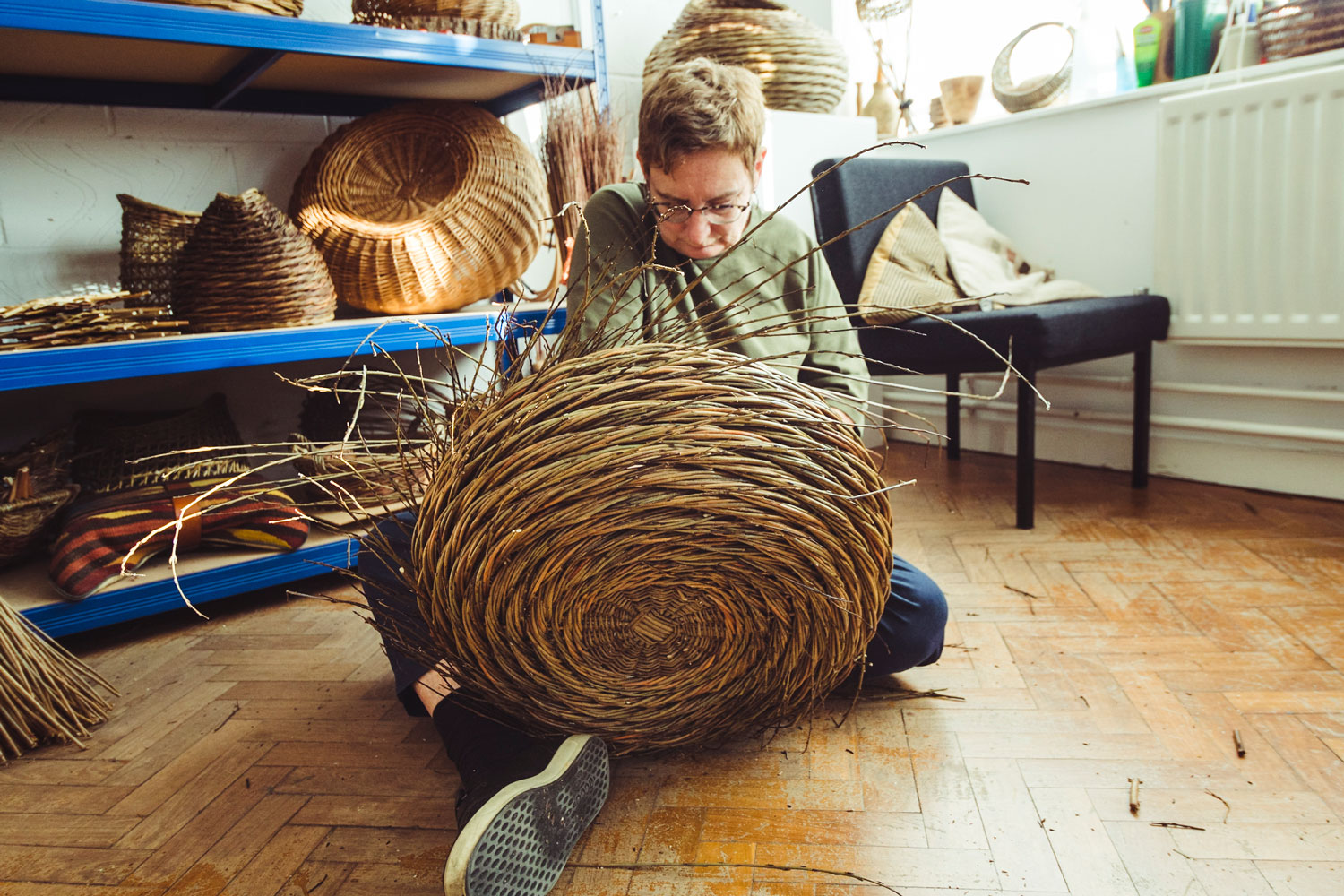 A studio full of baskets, a work bench with tools by the window, a corner filled with bundles of different types of willow and a large metal tank: that is Alison Dickens’ crafting environment. After working in urban regeneration for years, Alison came across Maggie Smith’s baskets and was enchanted. When she later met a group of basketry students at a Christmas Open Studios, their enthusiasm sparked her interest in learning basketmaking. In January 2019, two years after completing a course on the City Lit Basketry Course, she moved into her current studio at Cockpit Arts in London. Alison specialises in making sculptural forms with the rope coil technique, a time- and material-consuming technique which involves adding a new rod at every stroke and weaving with a bundle of willow.