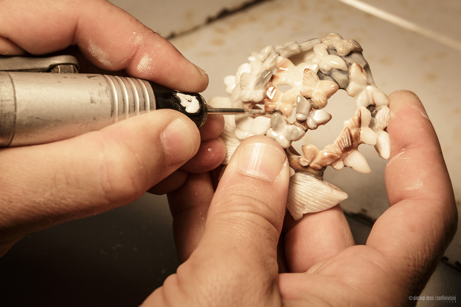 Inspired by the natural elements of his native Sardinia and the Mediterranean Sea, Andrea Cadoni is a very original jewellery craftsman. His unique creations are small wearable artworks telling stories and conveying deep emotions. Andrea, schooled in coral and semi-precious stone sculpture in Alghero, has always been curious about natural and non-conventional raw materials for his craft. He found his elective material in the seashell, the glycymeris, while experimenting as a goldsmith. “Pieces that are simply ‘well done’ are not enough”, he says. In his little sculptures, Andrea seeks “to achieve aesthetic harmony and at the same time to create a living story that can rouse emotion."