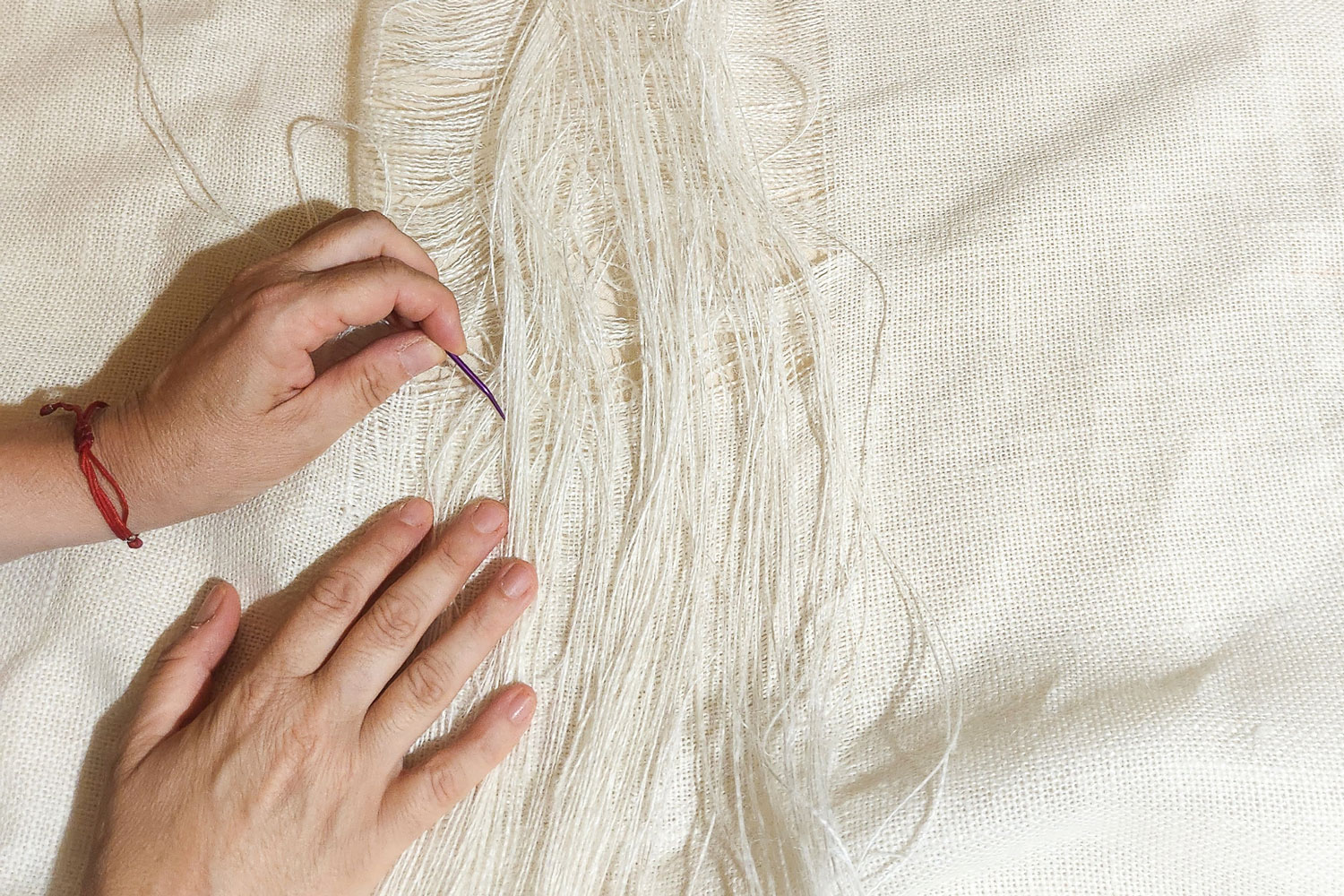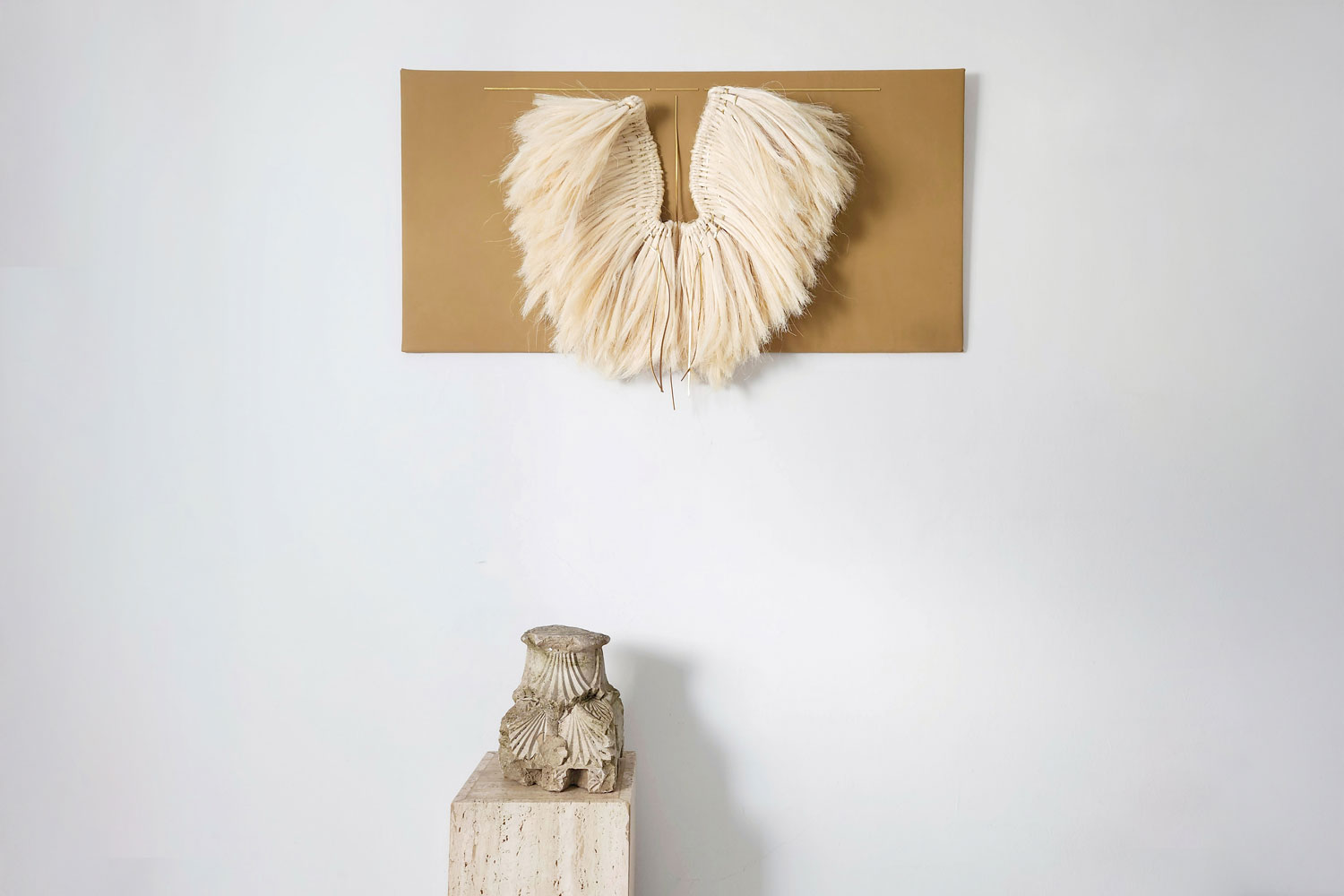 Anna Carmona is self-taught in textile art, with training in furniture restoration, polychromy, carpentry and carving. From childhood, she was influenced by her dressmaker mother, who taught her the value of handmade items, and her weaver grandmother, from whom she learned dedication. "Textile art offers a space of freedom to explore texture, form and emotion," she says. In 2021, Anna opened her workshop to research, work and experiment with fabrics treated with pigments, stucco and gold leaf, alongside surplus materials from the fashion industry. She creates pieces that evoke terraced hillsides, stone walls, the city and cultural life, inviting viewers to create their own inner landscapes. "Observing everything around us is an inexhaustible source of inspiration," she says. "Every detail can be a starting point for creation." Anna's work today is exhibited across Europe and the USA.