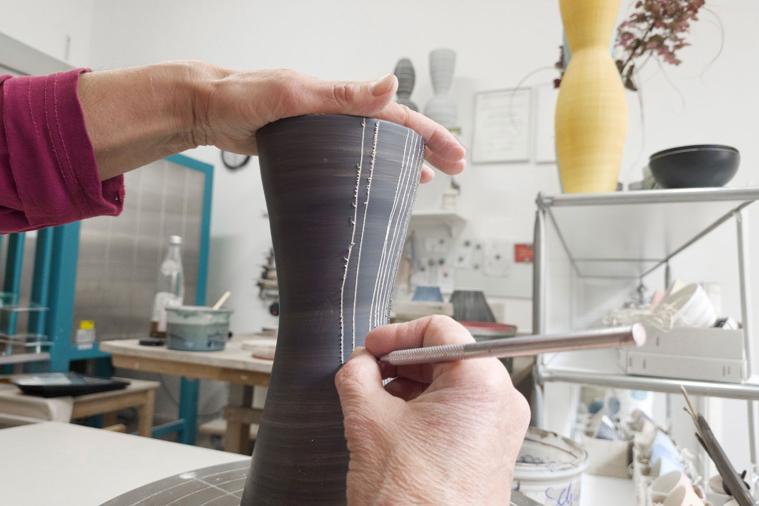 When Anna Sykora visited the Hedwig Bollhagen ceramic manufacturer at 15 years old, she instantly envisioned the life she wanted. She received extensive training in the field and in a traditional pottery studio, followed by studies in design in Höhr-Grenzhausen, Germany. Anna developed her signature technique in terra sigillata, a slip formula once applied by ancient Greek and Roman potters. “I experimented with pigments and oxides to integrate the technique into my own practice,” she says. Over the years, Anna has been recognised with several state awards. Today, she works solely with porcelain and decorates her pieces with scratched or recessed patterns that show her layered making process.