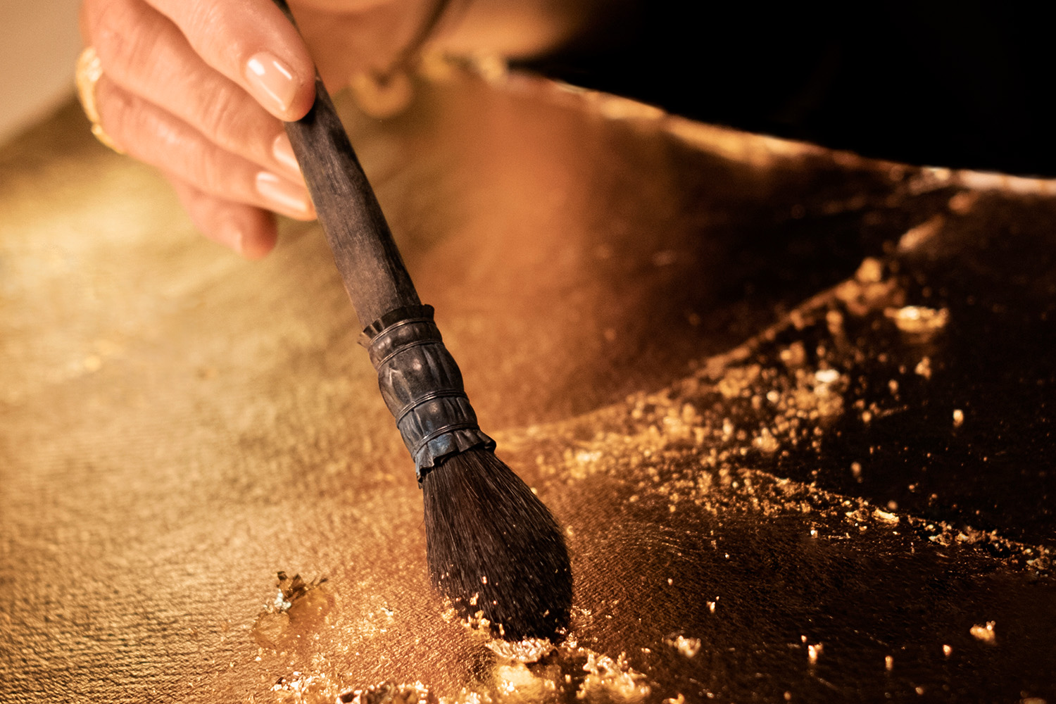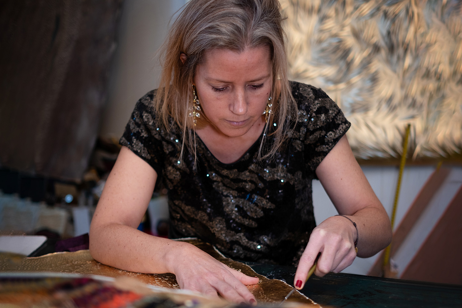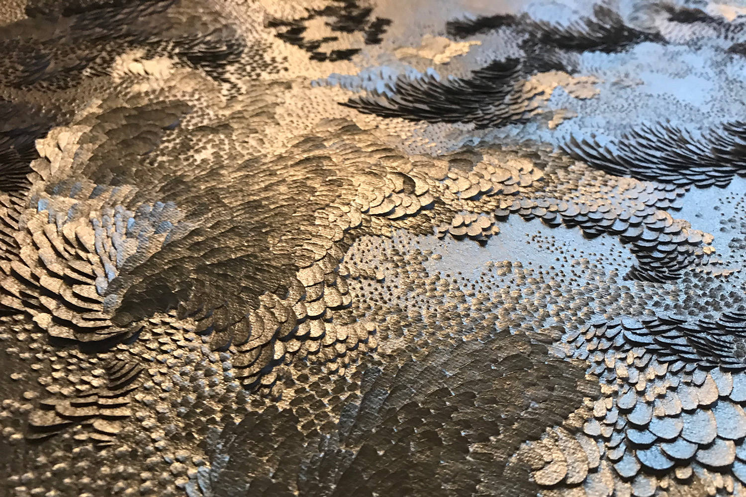 With a rich historical knowledge of the arts, Anne Féat-Gaiss developed a unique know-how, in which she subtly engages paper in a dialogue with other materials, from copper foil to painting. Among other degrees, Anne is a graduate of the École du Louvre in the art of Mesopotamia, India and South-East Asia, and of the École Pratique des Hautes Études in comparative archaeology. “Inhabited by all these teachings, I gradually created my own universe, a syncretism of these different influences, a confluence of the myths and mythologies of ancient peoples, a blend of philosophies and artistic techniques.” So, by marouflaging metal sheets on paper, incising this with a scalpel, painting it and merging other precise gestures, Anne gives life to impactful bas-relief sculptures, sometimes in very large scale.