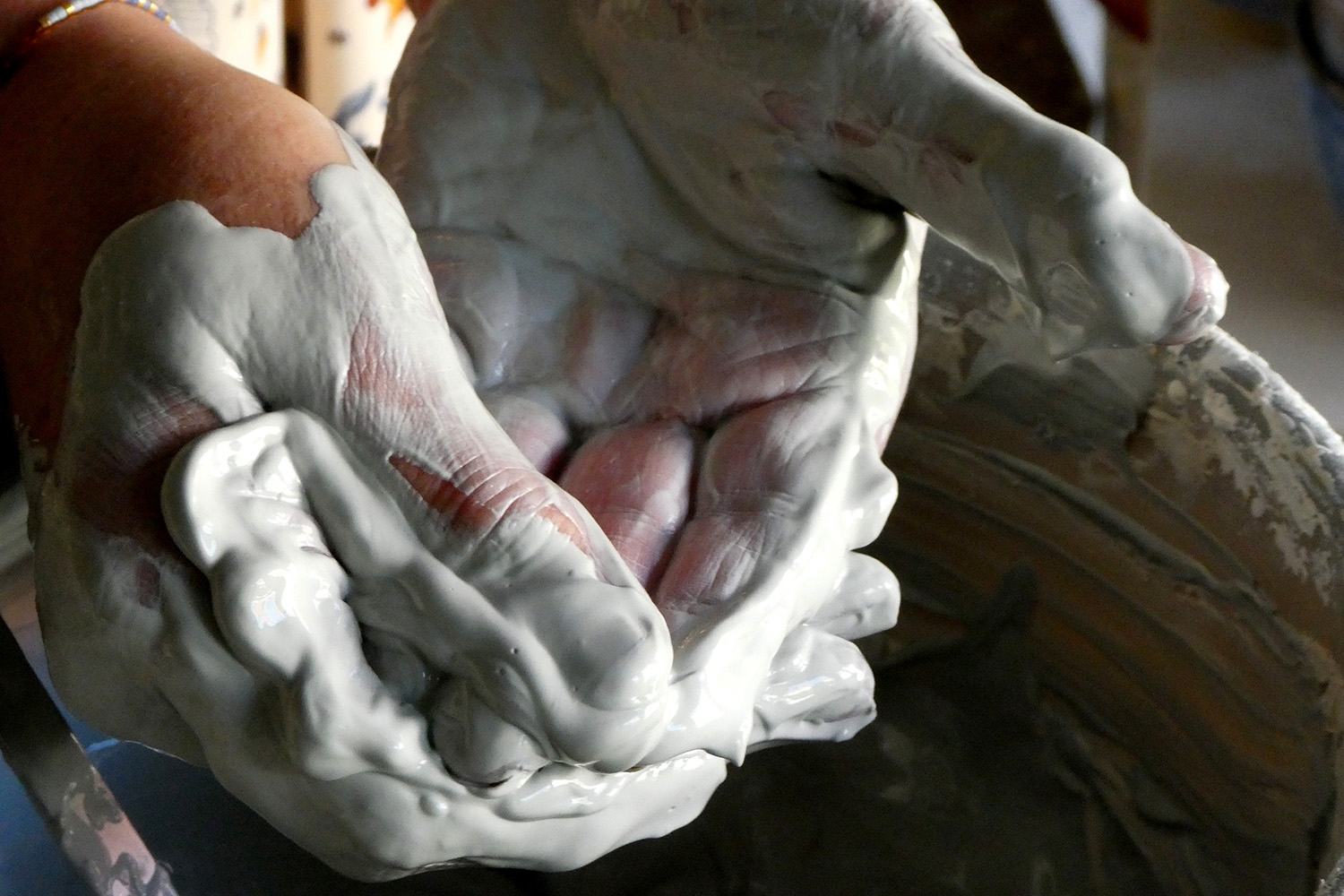 After two years of studying history of art at the University of Ghent, Anne Mortier had made her mind up: she was going to switch from a theoretical approach to a physical practice. She chose ceramics because it was an offbeat discipline at the time. “I dreamed of educating people in what could be called a ‘good’ pot – to Bernard Leach’s standards – where form, glaze and function come together,” she says. Anne was also the only student working with high temperature fired stoneware, so she had to learn about high-firing methods by taking extra classes. She attended masterclasses with artists such as John Leach, which helped her develop her high-firing technique. She later adopted a more graphic technique.