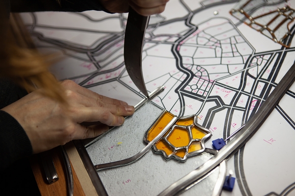 Annelies Cosaert has always been fascinated by stained glass. “With the use of light alone, it can tell different stories in dialogue with architecture, interior design, religion, mythology or history,” she says. Initially, Annelies pursued a career in cultural heritage preservation, for which she spent three years in Los Angeles. “A very satisfying job, but I felt my creative side becoming dormant. Before moving back to Belgium, I had a dream in which I was working with stained glass again. I felt free and whole, two parts of my brain collaborating, creating a peaceful mindset.” She made this dream come true and founded her own workshop, Atelier Kozaar, in Brussels. In this creative space, she is now constantly challenging herself. “I love to redefine the visual language of stained glass.”