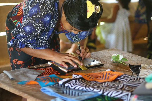 Rosmery Uribe learnt everything she knows about molas simply by observing. Since the age of six, she watched her mother embroider colourful animals and geometric figures onto cotton. At 12, Rosmery could sew by herself. She would cut the cloth, draw the design, thread the needle, and embroider a fish, a food that Gunadule women traditionally eat after childbirth. Today, Rosmery is the president of Asoimola, which was created in 2005 with the purpose of selling the creations at craft fairs and events. She has represented the group in important national and international events, such as the International Folk Art Market in the USA, and L’Artigiano in Fiera in Italy.