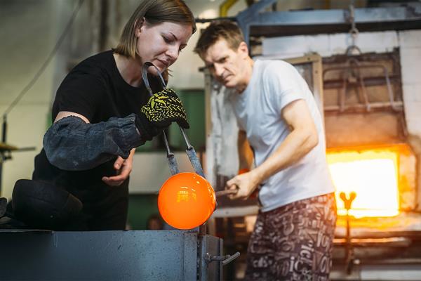 Baiba Dzenite always wanted to be an artist and designer. While she was studying, she had the chance to visit a few hot glass studios in the Czech Republic, which focused her attention on the hot glass technique and led her to found her brand, Baiba Glass. Because she enjoys working with different types of glass, she often works in different studios, but aspires to have her own one day. Her main technique is glassblowing, but she also works with cast glass and loves to experiment, combining glass with other materials and finding her own techniques. In that way, her beautiful glass artwork becomes unique and distinguishable from other artists.