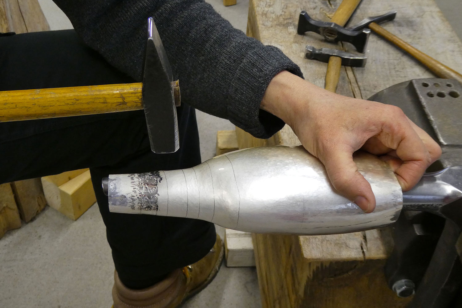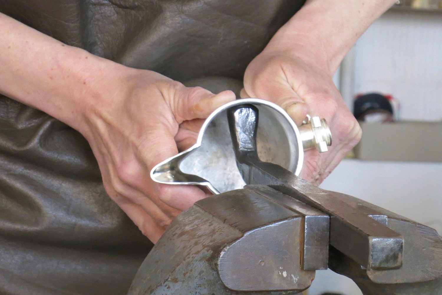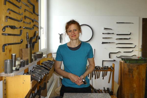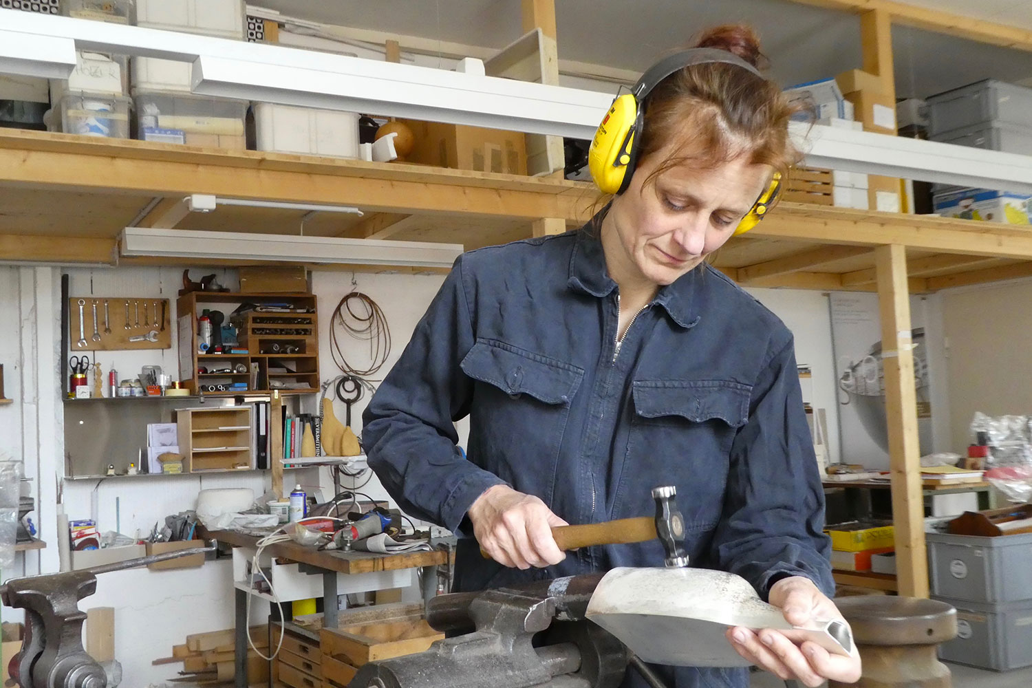 Forging, raising, mounting, brazing, casting, surface refinishing... Barbara Amstutz masters all traditional silversmithing techniques, with which she creates artistically designed contemporary silverwork in her studio near Basel. She initially pursued academia, studying history, philosophy and comparative religious studies at university, but she never stopped being creative, and subsequently decided to commit herself entirely to metalwork. After years of training in Switzerland and abroad, she opened her own workshop in 2006. She enjoys the challenge of working silver by hand and by machine to create contemporary designs with traditional techniques, inspired by Switzerland and Swiss culture.