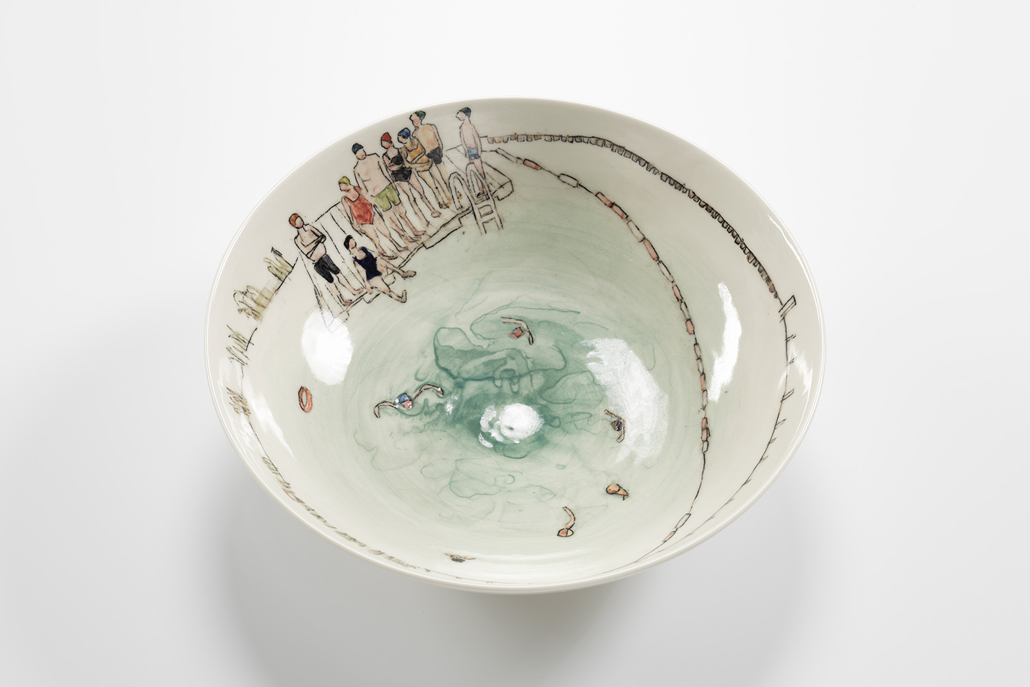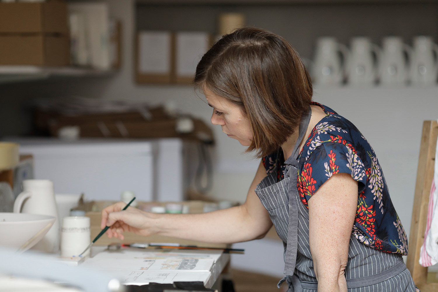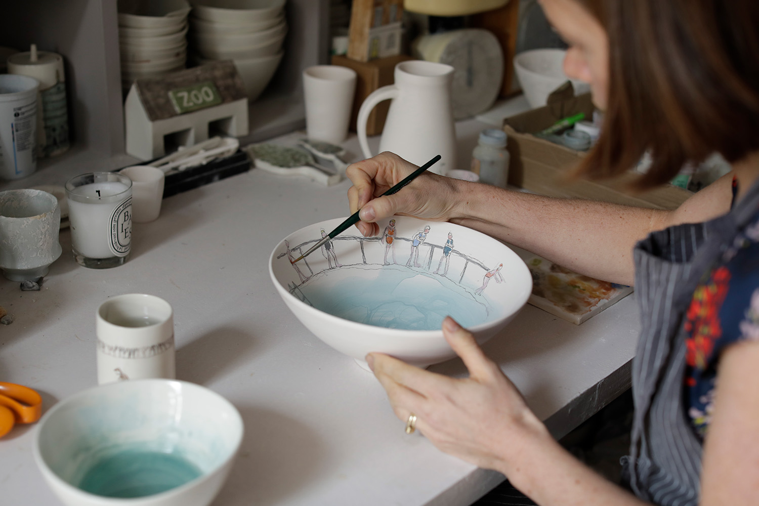 Helen Beard is an illustrator who works on ceramics as her canvas. She studied at Edinburgh College of Art where she discovered ceramics, although she initially disliked clay because of its messiness. But she did quickly fall in love with the material. After a great apprenticeship, she began her own studio practice. Her creative process begins by watching people and discovering stories, which are captured in her sketchbooks. Then she creates the ceramics and draws on the porcelain through carbon paper, so she cannot see the illustration as she is making it, which is key to achieving her style. Helen makes both one-of-a-kind hand-painted exhibition pieces and also has a series of ceramics for functional daily use produced in Stoke-on-Trent.