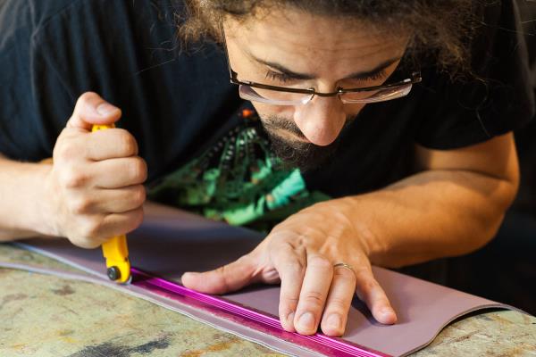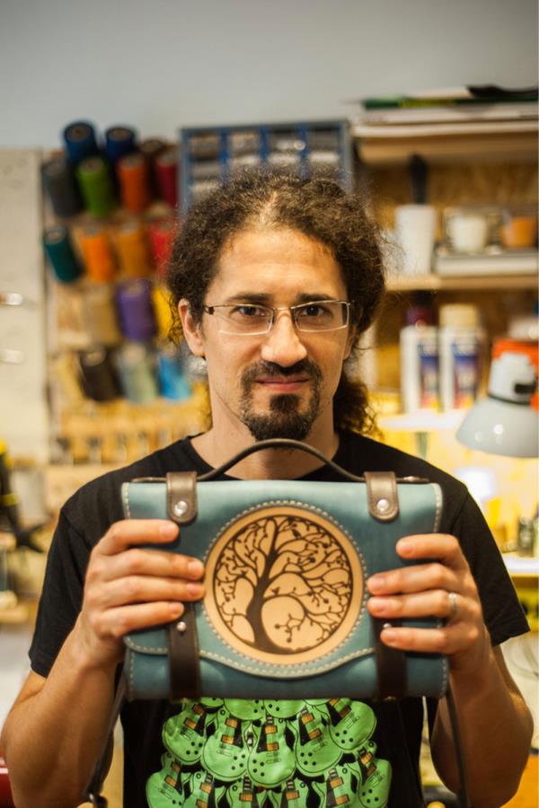 After several years spent in graphic design, Bogdan Deliu started making leather goods in 2012. A year later he opened his own workshop and he has dedicated his entire time, knowledge and creativity to this craft ever since. He is self-taught and loves being a one man show in managing his handmade business. He often reinterprets Romanian motifs in the making of unique creations, which go beyond the traditional leather craftsmanship of local artisans. Bogdan pays great attention to the type of leather he works with, always choosing the material that allows him to bring to life the designs he envisions. He considers himself a modern alchemist who experiments with colours, shapes and textures and rarely uses the leather as it is.