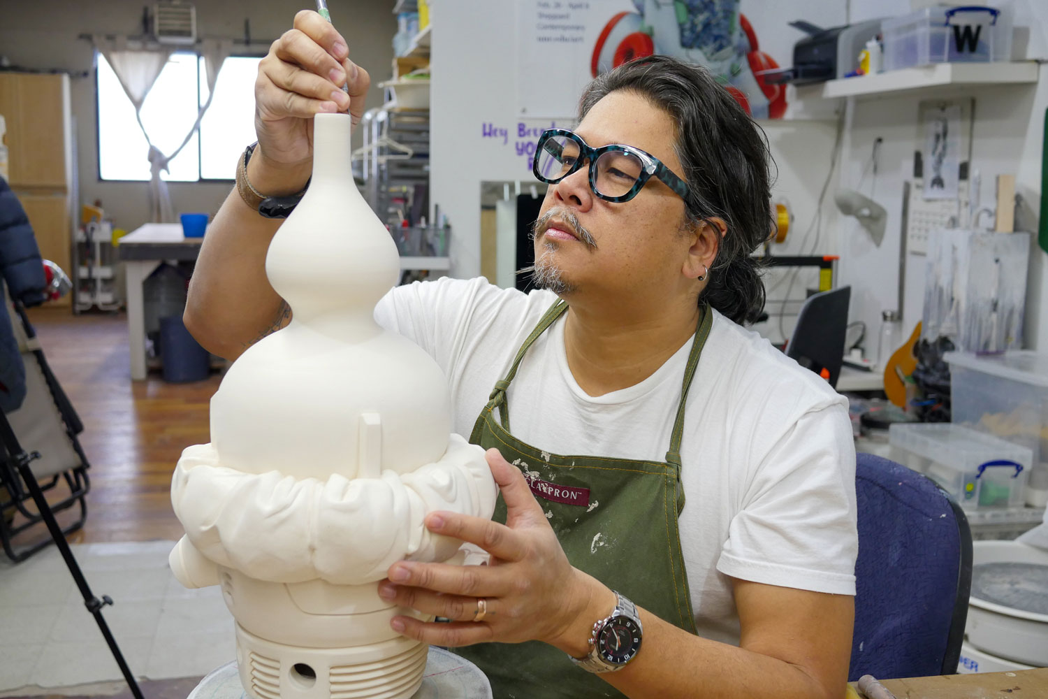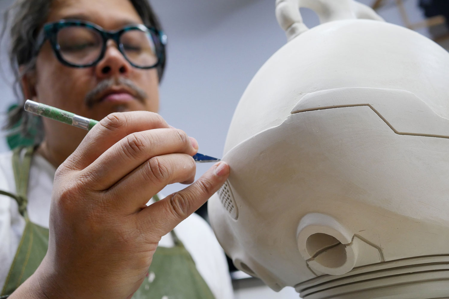 Brendan Lee Satish Tang is a Trinidadian-Chinese-Irish-Canadian ceramic artist. His research-driven practice in ceramic sculptures studies hybridity, technology and the plurality of cultural identity. Brendan is best known for his long-running Manga Ormolu series, in which he fuses blue and white vessel forms referencing Chinese dynasties with robotic, manga-inspired ornament, all modelled in clay. Now based in Vancouver and teaching at Emily Carr University, he puts his technical virtuosity to the service of storytelling about migration, memory and the tempo of technological change.
