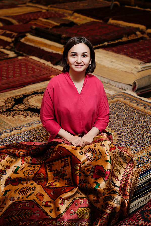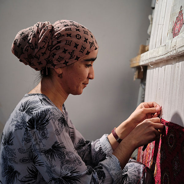 Sabina Burkhanova preserves the ancient craft of carpet weaving and all that makes it spectacularly local and unique. She established Bukhara Silk Carpets in 2010, following the tradition passed in her family through generations. Throughout all these years Sabina claims that hundreds of apprentices have learned with her. "Young people learn the intricacies of this complex art to make sure that the tradition lives on," she says. In her workshop she and her team produce a particular type of silk carpet, specific to the Bukhara region. These carpets have short piles, which are practical in the dusty climate. Another typical feature is that Sabina's patterns always contain some shades of red, a colour linked to the power of the sun and to flames.