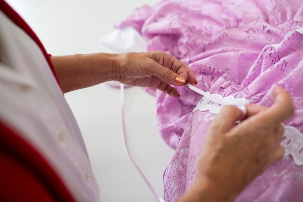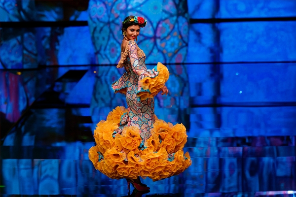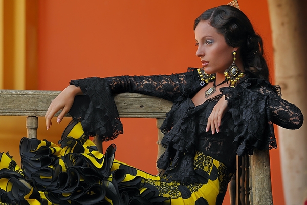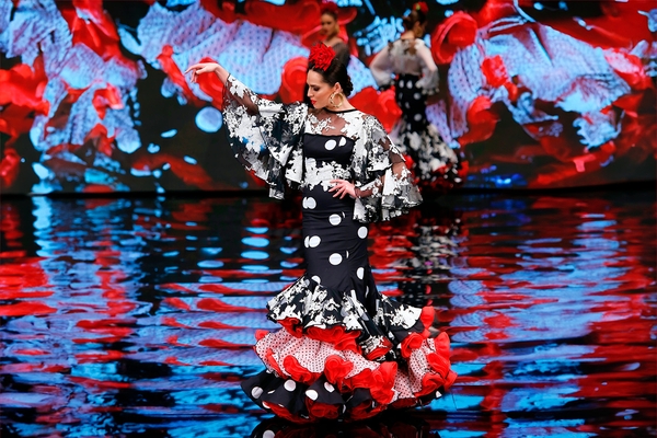 Carmen Vega works tirelessly to model the ruffled textiles that give her dresses their characteristic volume and flair. As the sole seamstress of her atelier since 2020, her diary keeps busy all year long, especially during the fall and winter season when she prepares the year’s collection for SIMOF, the International Flamenco Fashion Show taking place every February in Seville. Carmen has positioned her artistic fusion designs as the year’s trend by winning top distinctions at the world’s top venue for flamenco fashion. It has been an exciting and laborious career since she opened her shop in 2004, after roaming the country for years as a military spouse. She settled with her family in the border town of Ayamonte in 2000 and decided to follow her passion for dressmaking, translated in the flamenco costume tradition she grew up with. Her dresses are thematic inspirations drawn from her travels and connections with other cultures, graciously fused with Andalusian tradition and its humble origins in a daring style.