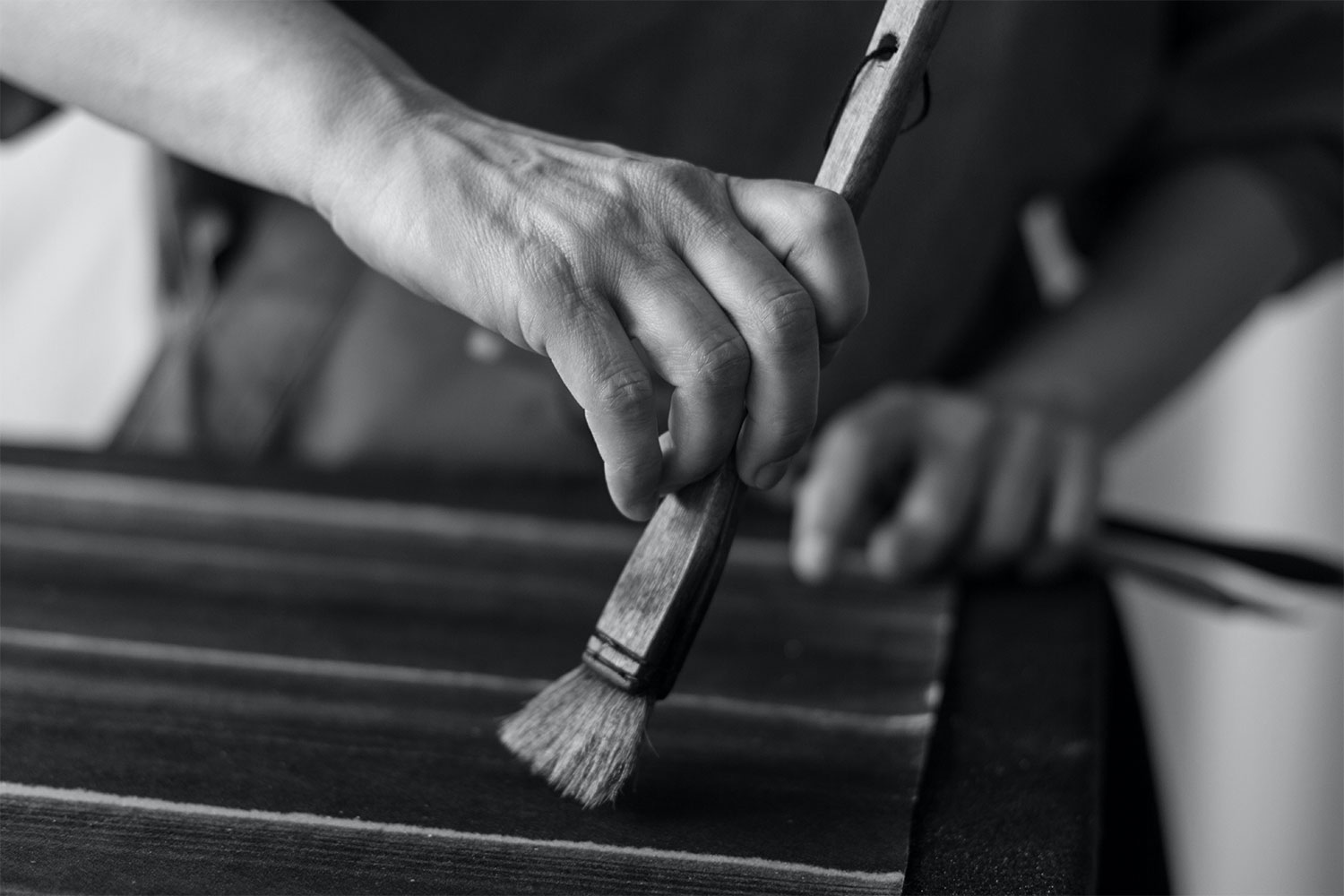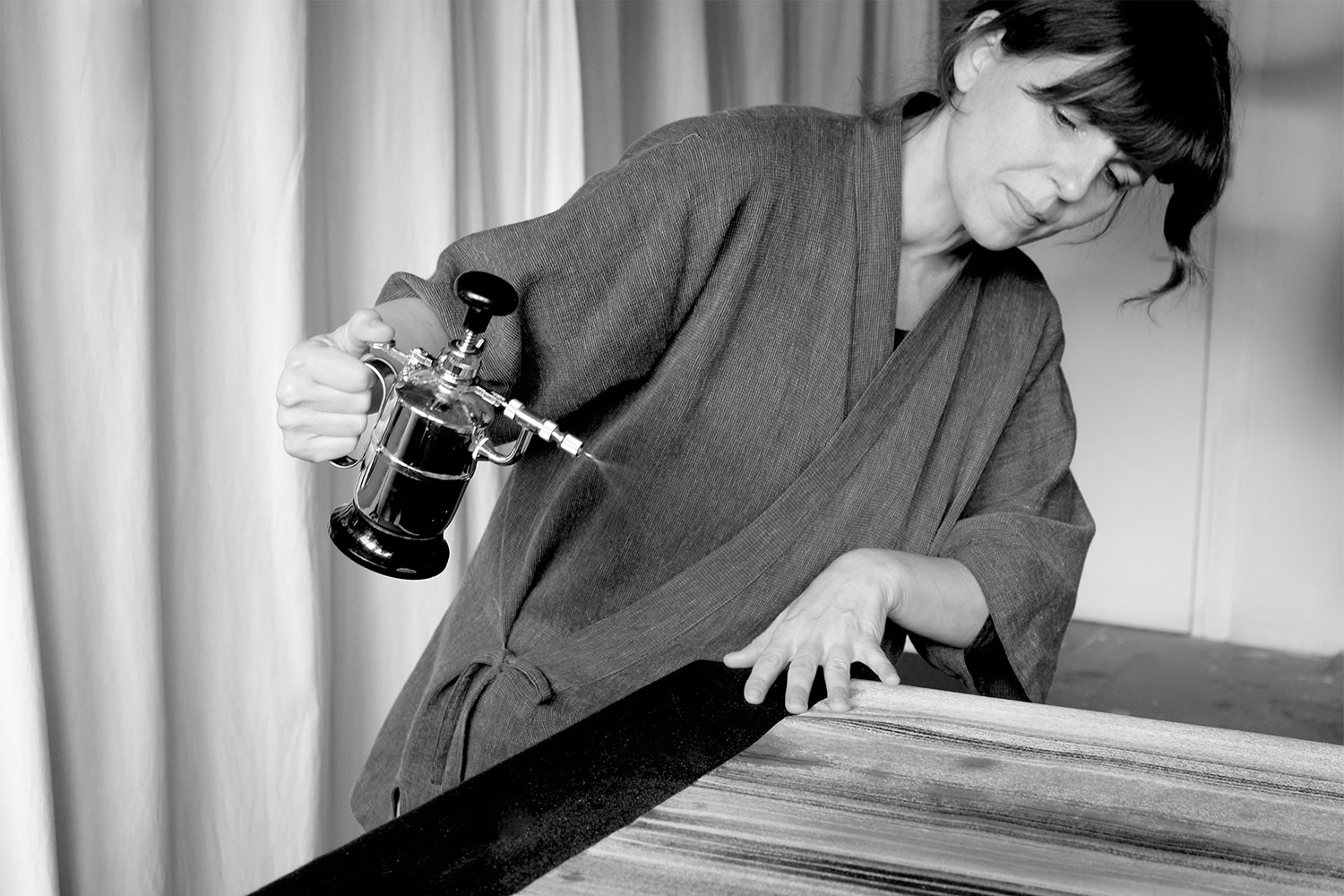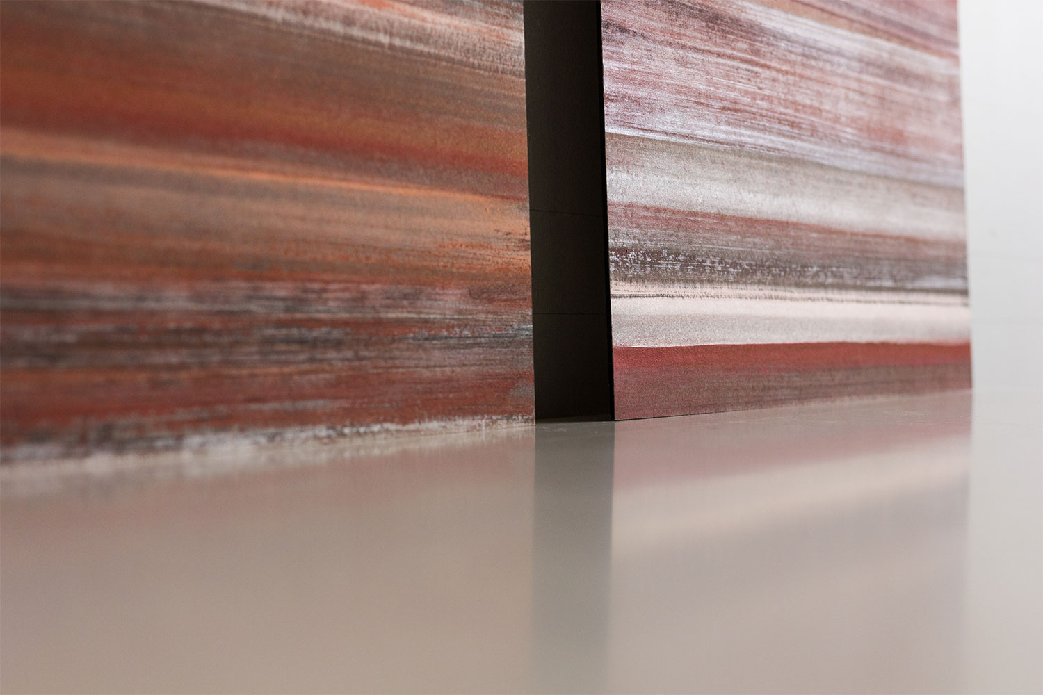 Through her decorative panels, Caroline Besse explores the sensitivity and intensity of colour. With her unique mastery, this artisan-painter has created her own medium with which to paint, a substance that combines the fluidity of Chinese ink with crushed minerals, creating a rich and luminous texture. After studying Van Der Kelen's decorative painting techniques, Caroline trained in Chinese calligraphy and ink painting under a Chinese master. She encountered crushed minerals through Buddhist painting, while Nihonga, traditional Japanese paintings, form the basis of her craft.