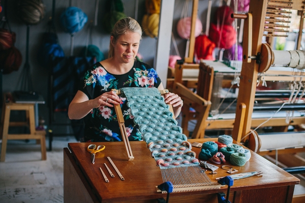 Originally from Montreal, Canada, Cassandra Sabo fell in love with weaving while studying textile design in London, at Central Saint Martins. Believing that the craft was a great combination of her skillset, she chose it as her specialisation in her second year. As she also found out she was pregnant, Cassandra was encouraged to take time out and return for her final year. Keen not to lose all the knowledge she had absorbed she purchased her first loom from the university and continued to weave during her time off. After opening her studio in Oxford in 2014, she began to experiment with a new range of materials, techniques and process from different crafts, developing a unique style of weaving and a design aesthetic that fuses inspiration from her travels with her love of experimentation.