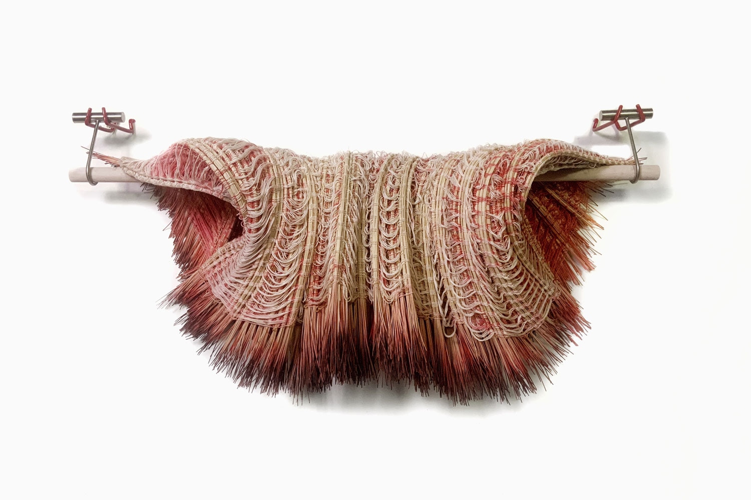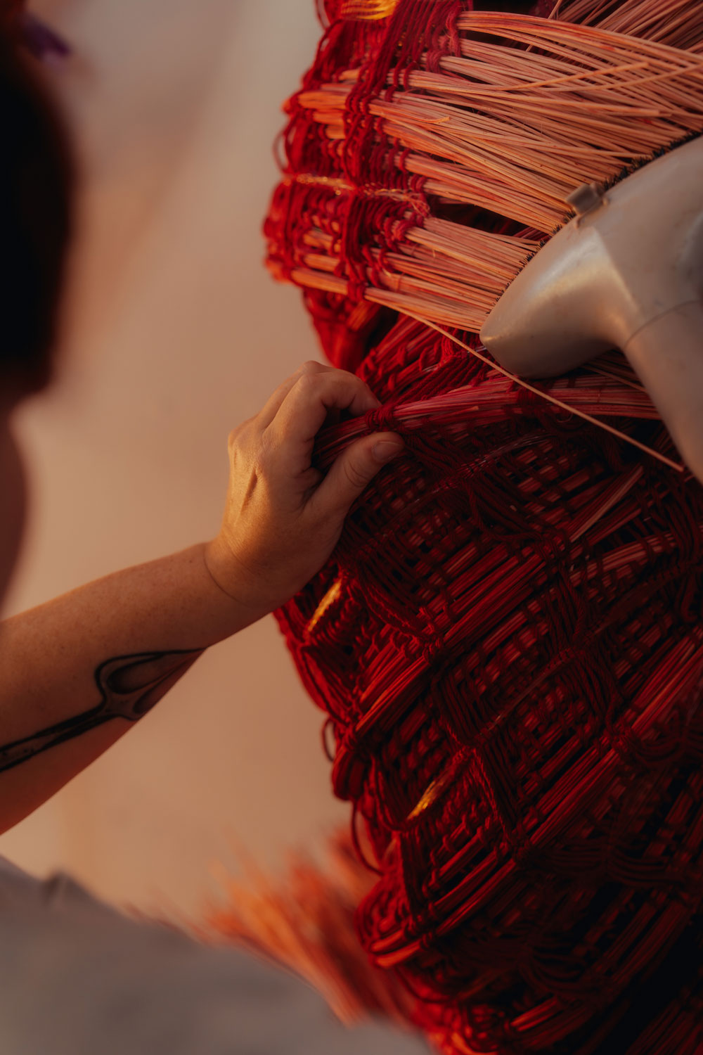 Charlotte Blake creates vivid textile sculptures with weaving at the core of her practice. Trained in drawing and painting at OCAD University, she came to textiles through a dissatisfaction with the constraints and approach she felt in painting. “Weaving allows me to embrace mistakes and offers greater creative freedom,” she says. Blake works primarily with floor looms, using materials such as rattan and other semi-rigid fibres that allow woven surfaces to be shaped into 3D forms after being released from the loom. She often uses negative space as a tool to emphasise the material in her creations. “I see weaving as part of a continuum of labour, skill and transmission, where tools and knowledge are passed from one maker to another,” she says.