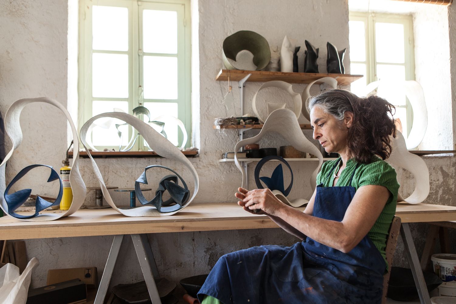 Her flowing forms represent the vibrations of her soul. For Theodora Chorafas, art is therapy, and transforming the clay allows her to transform and shape her emotions. Born in London and now based in Greece, Theodora studied ceramics and decorative arts in the UK, Italy and Switzerland. Her fascination with clay dates back to her years as a student. At 14, she signed up for a ceramics evening class, where she felt finally she understood the world by giving form to it with her hands. Since then, her works have been exhibited all over the world. She teaches ceramics, curates exhibitions and organises workshops in Greece, Spain and the US. In 2006 she was awarded first prize in the European ceramics contest in Bornholm, Denmark.