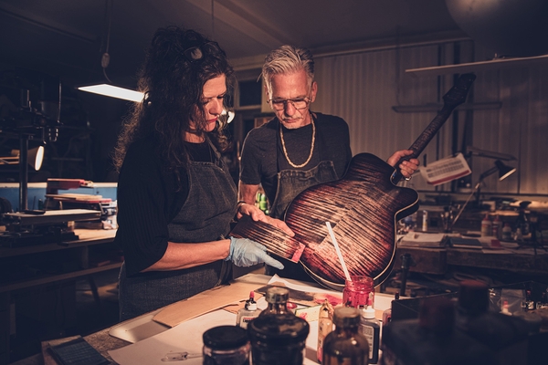 Whilst Claudio Pagelli has been making guitars since 1978 after first training as a piano maker, Claudia Pagelli, a trained designer, joined ship in 1990. What triggered this move for Claudia was Claudio asking for her opinion about a model he was working on. She was then hooked, and the duo has been creating together ever since, building custom-made, one of a kind guitars and basses. "Guitar making is a special craft that requires a lot of sensitivity and human understanding in order to build an instrument tailored to someone’s need," explains Claudio. Every instrument has its unique story, and each client is an opportunity for a new creative challenge. Crafting the perfect musical match in their workshop is Claudia and Claudio’s mission, bringing together design, craft and passion.