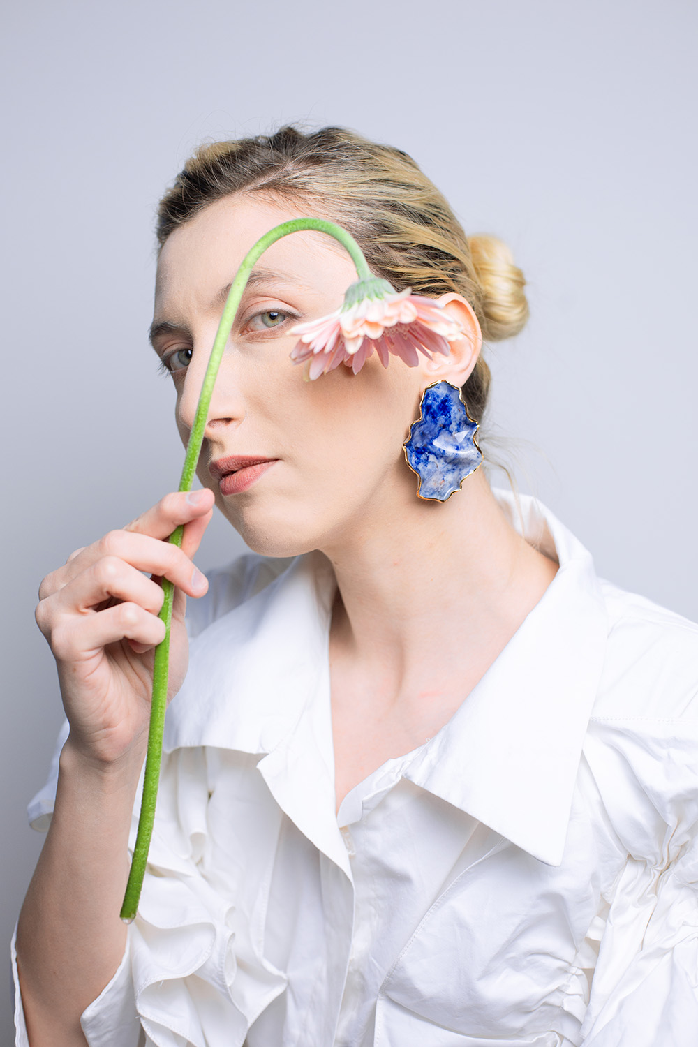 Diana Cojocaru studied painting for 23 years and has a Master’s degree in architecture. She learned to paint from a master painter for 11 years and is self-taught in porcelain sculpture. Realising that working with this material allowed her to translate her artistic vision into 3D objects, Diana started practising her craft at home around 2016, playing with porcelain clay and discovering its properties and limitations. It took about two years of self-teaching before her first collection of jewellery was ready. The adornments and interior design objects that she creates are inspired by nature, often rendering botanical elements in vibrant colours. Diana's jewellery pieces are typically wavy and crafted with great attention to aesthetics. The making process includes successive stages, from cutting forms without moulds and shaping or carving them in palms to glazing and painting with gold.