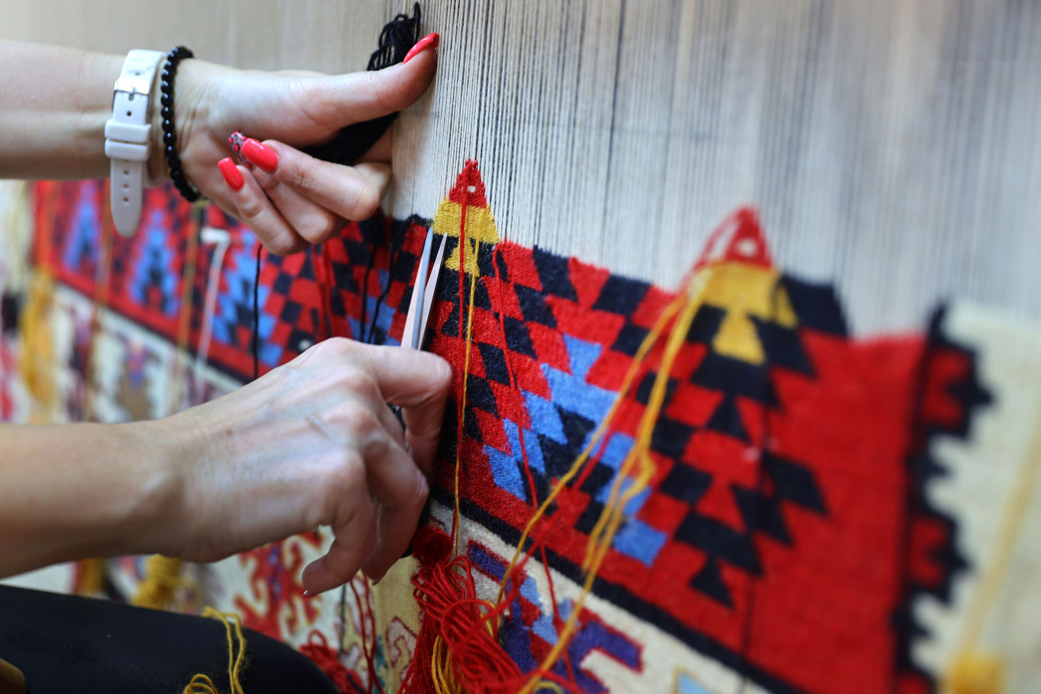 Founded in 2009 in Pirot, a town in southern Serbia, Damsko Srce is an all-women artisan cooperative committed to preserving the ancient craft of Pirot rug weaving. This distinctive technique, unique to the Pirot region, is famous for its double-faced weave with no visible reverse and is officially recognised as part of Serbia’s intangible cultural heritage. The Pirot rug is protected by a geographical indication, meaning it can only be made locally using traditional methods. .
