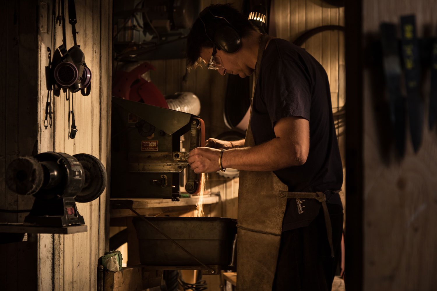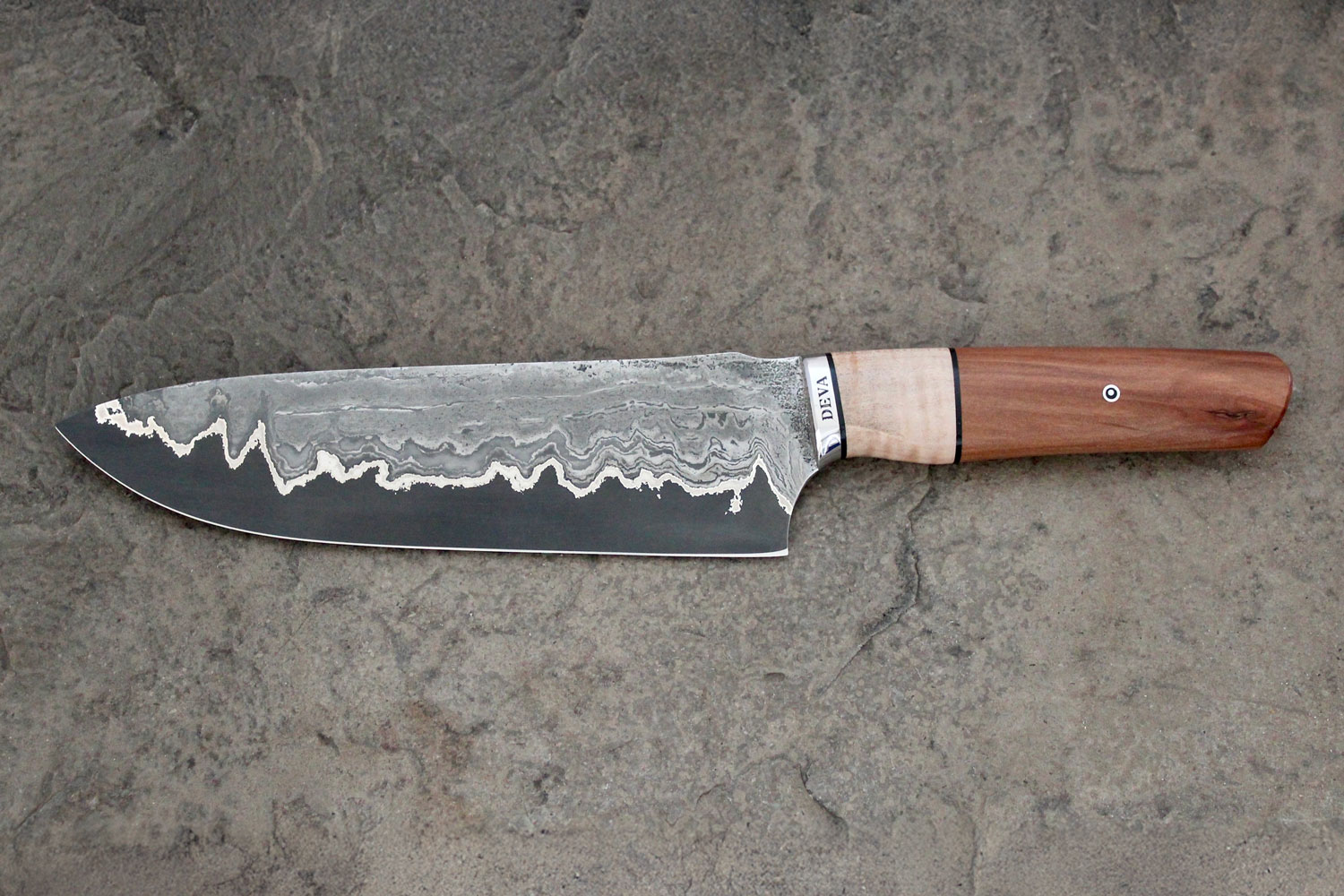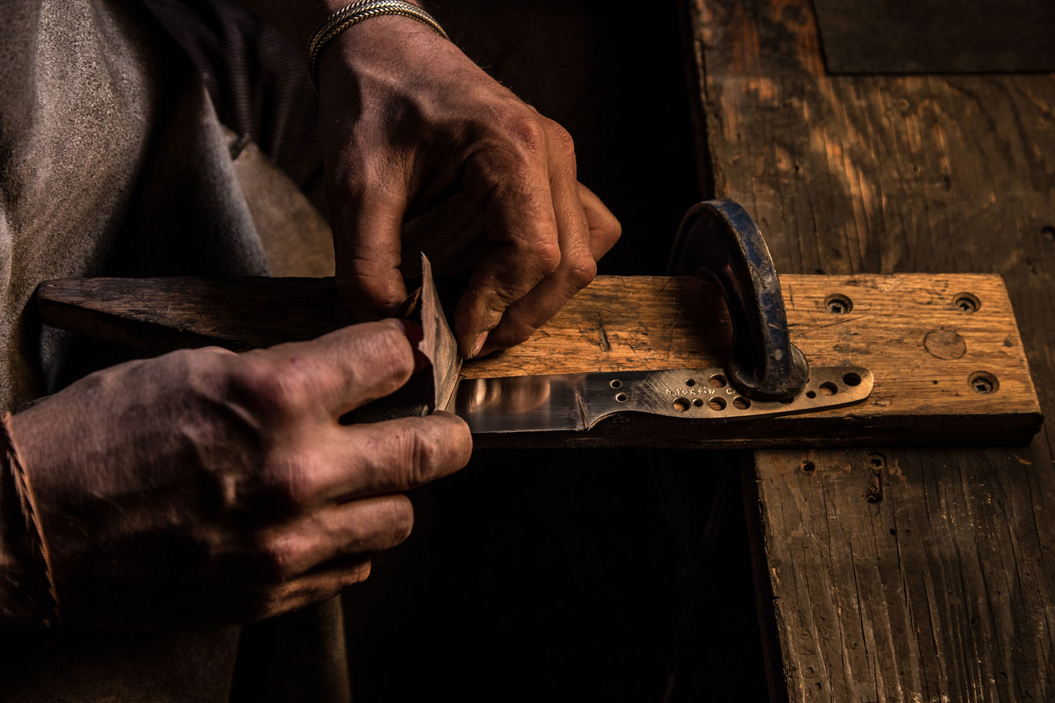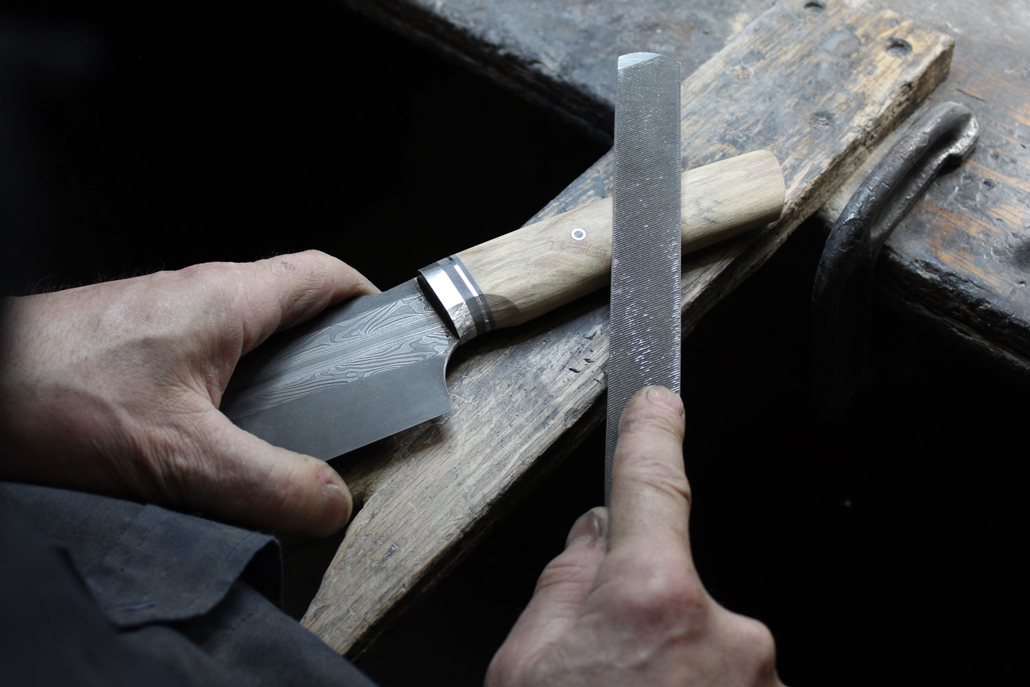 Dave Fortin is a bladesmith and taillandier who forges custom knives and tools from carbon steel. Working from his two sites, a rented historic forge on Île d’Orléans where he welds and forges Damascus steel, and a downtown studio where he shapes and fits blades, he creates functional knives for chefs and tools for workers. Wooden handles are often made of reclaimed materials. “I favour reclaimed Quebec woods which often comes from my farm or from my clients,” he says. Dave builds patterned damask steel by stacking, welding and reworking layers, then combines the blades with wood that has been stabilised through low-pressure resin treatment. The resulting pieces have an ergonomic warmth in their handles that enhances their function.