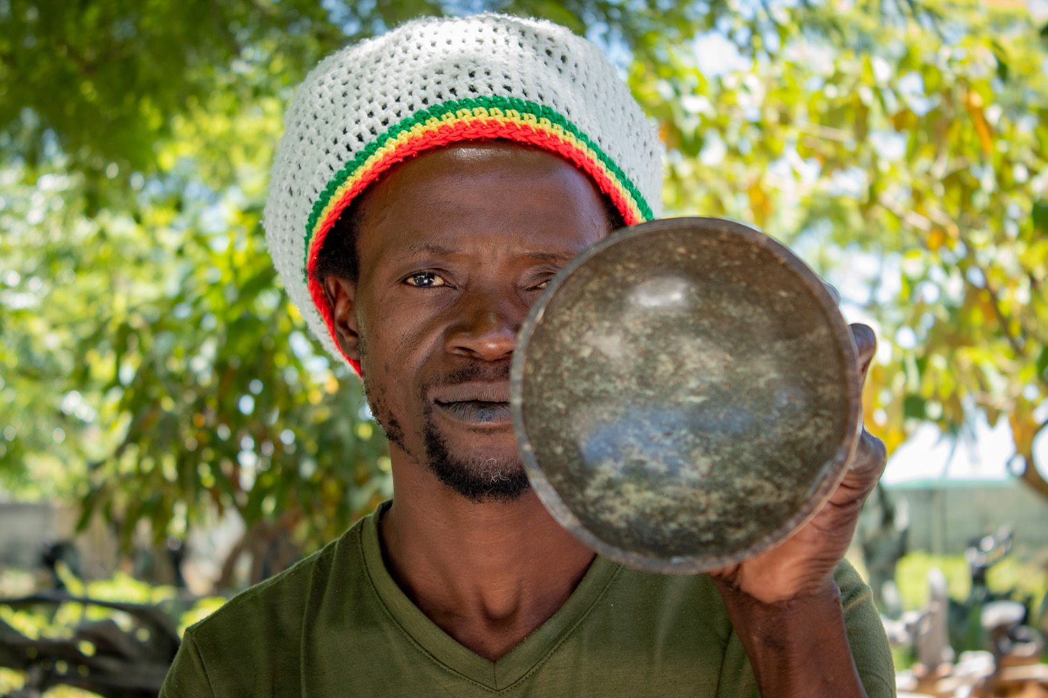 Davis Sibanda refers to himself as a born creator and sees his talent as a great gift from God. Self-taught, he discovered his creative skills at school and began making wire crafts, a popular local childhood past-time. Davis opened his workshop in 2000. The first object he made was a human figure, and since then, he has developed as a sculptor, carving bowls, decorative objects, and musical instruments. He uses different materials such as stone, wood, reclaimed bone, wire, and metal. Davis also specialises in the decorative engraving of animal skulls*. On a mission to “keep Shona sculpture and music alive,” he draws on influences synonymous with Zimbabwe’s culture and artisan heritage. (*The skulls come from animals who died from natural causes and are sourced from the Zimbabwe Parks & Wildlife Management Authority.)