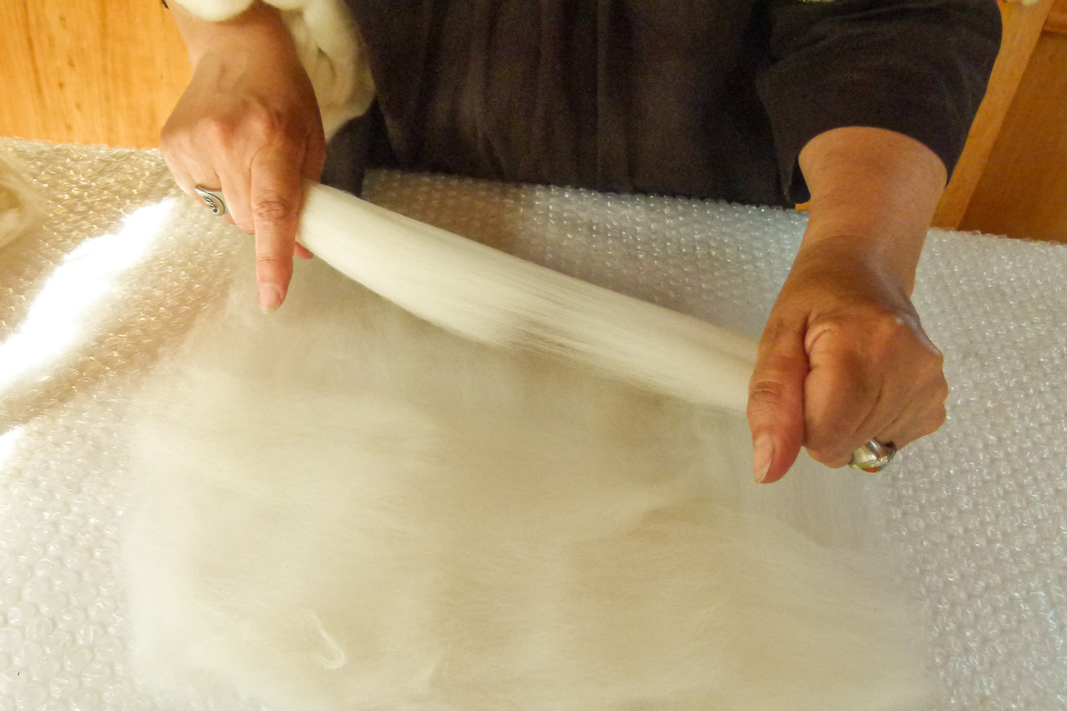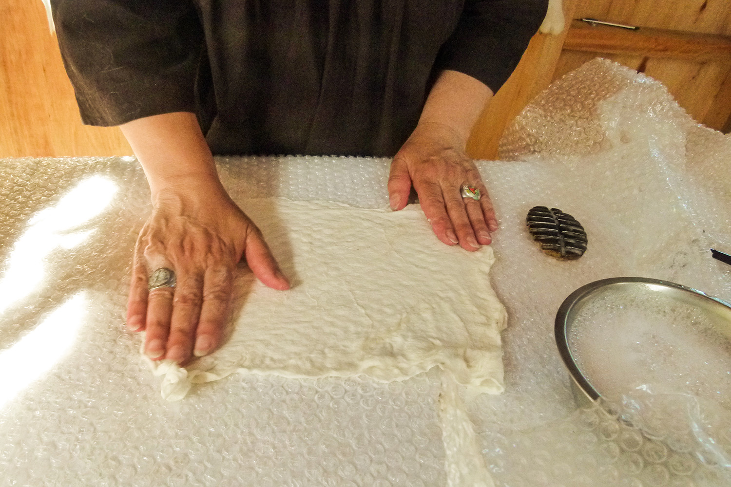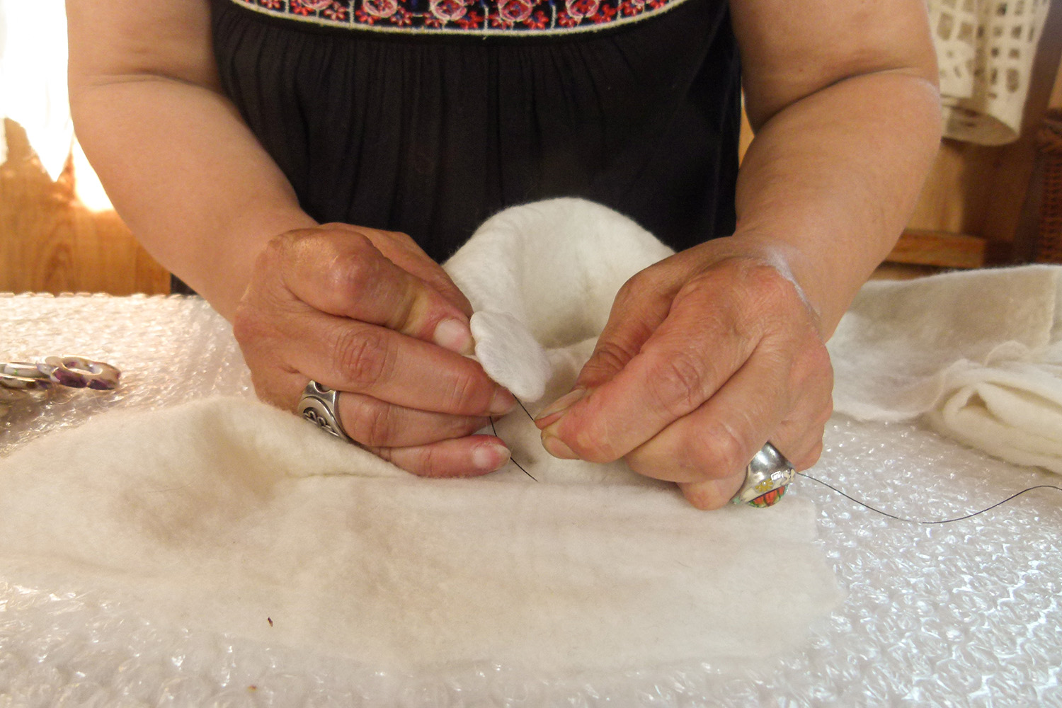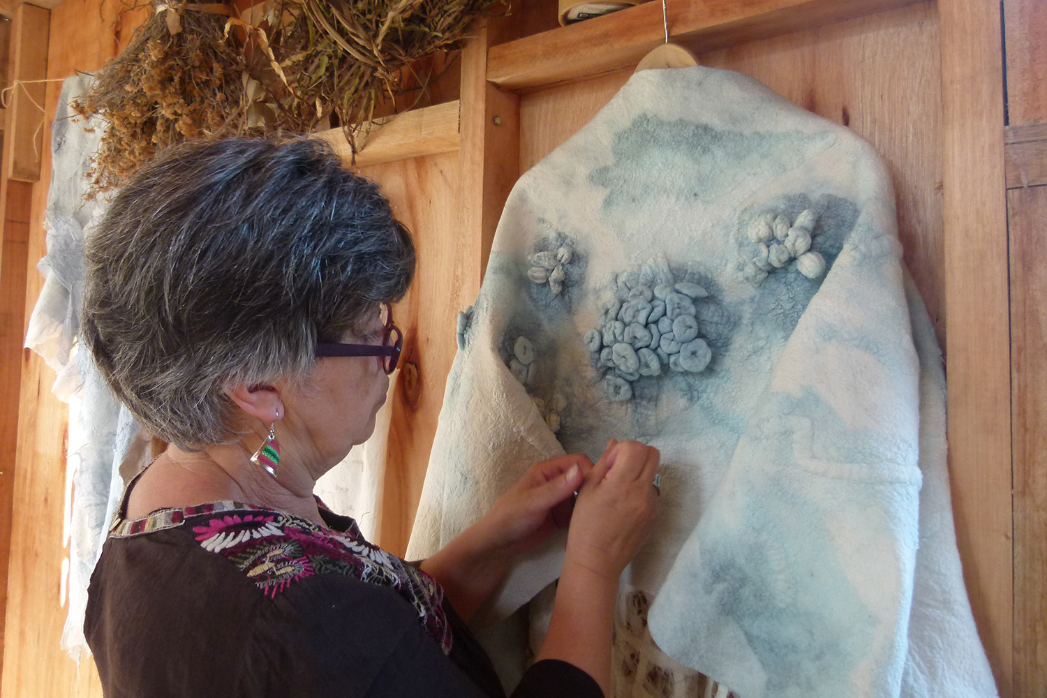 For Pilarica de León, who was raised in her aunts' haute couture workshop, textiles, fashion, cutting, colours and textures have always been part of her life. She took up this interest on her own later in life. She discovered the techniques of handmade felt and textile making and found great joy to experiment with these. After spending some time in Buenos Aires, Pilarica returned to Uruguay, where there is a long tradition of wool and textile production. This is how she found her expressive medium. "Over the years the materials and I have made a good team. I rarely design the piece beforehand. The contact with the materials, the table, the water, the soap and the fire dialogue with me and I with them," says Pilarica. "Wool is Uruguay's international insignia for its fineness and quality. It is also present in garments that are very representative of our culture, the poncho, the ruana, the shawl," she says.