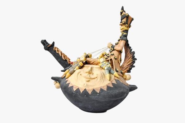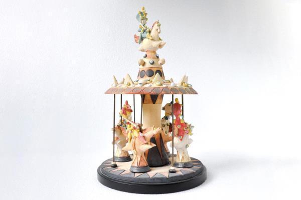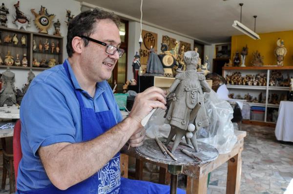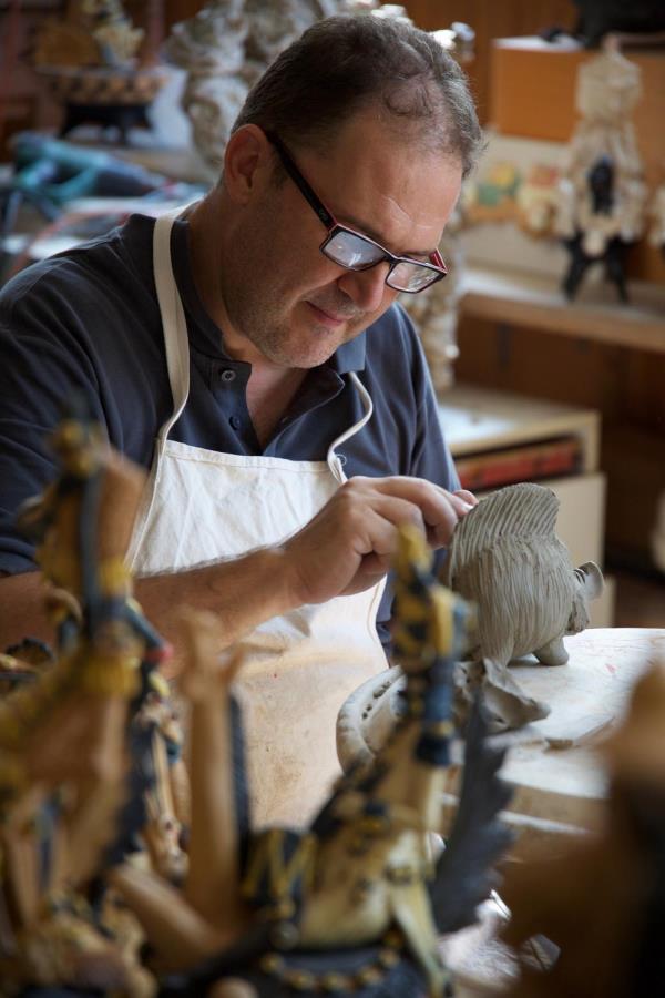 Diego Poloniato inherited his passion for making Cuchi, small terracotta sculptures that also function as whistles, from his father Domenico. After studying at the Istituto d’Arte per la Ceramica Giuseppe De Fabris in Nove, his hometown, since 1990 he has worked with his father as a master ceramicist. He loves to play with various materials and to mix different types of clay to get new colours. During his career, Diego has taken part in numerous exhibitions, winning awards for his interpretations of this Veneto tradition. His favourite subjects are cockerels, hussars on horseback, clowns and dolls, Pinocchio and a variety of animals that inhabit his fantasy. In his workshop, "you can find just happy things," he says.