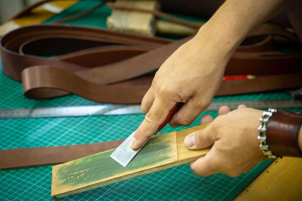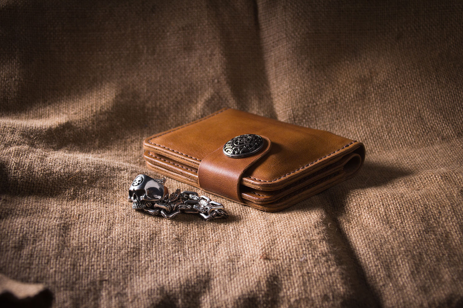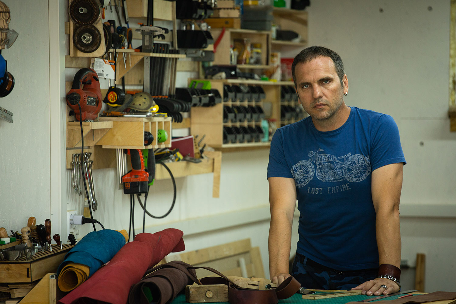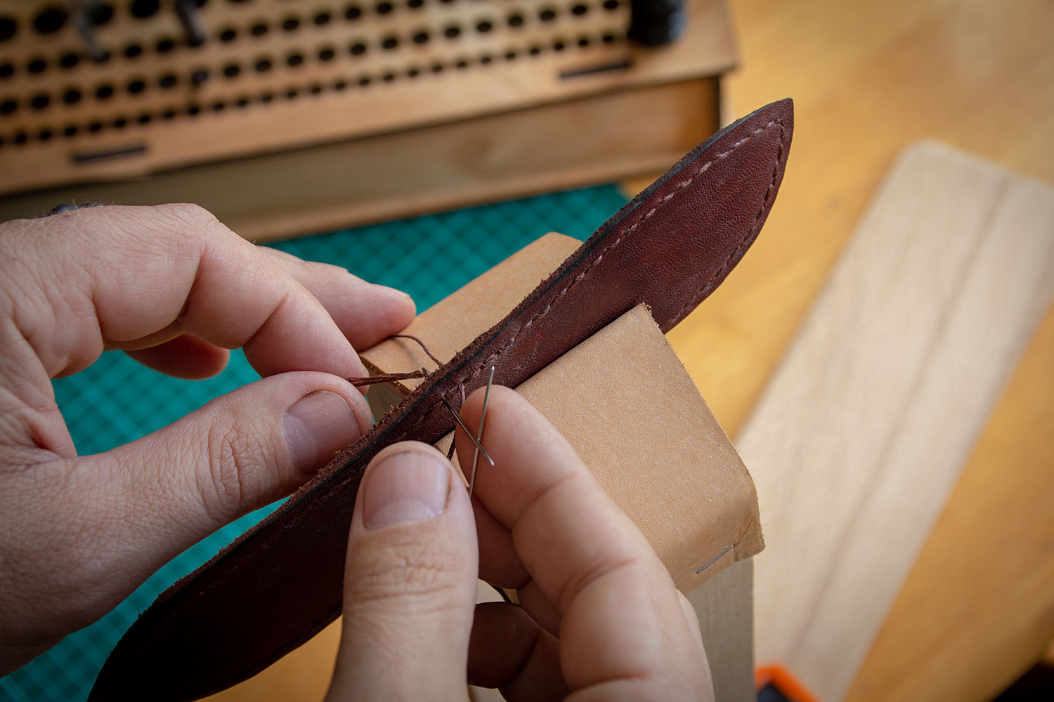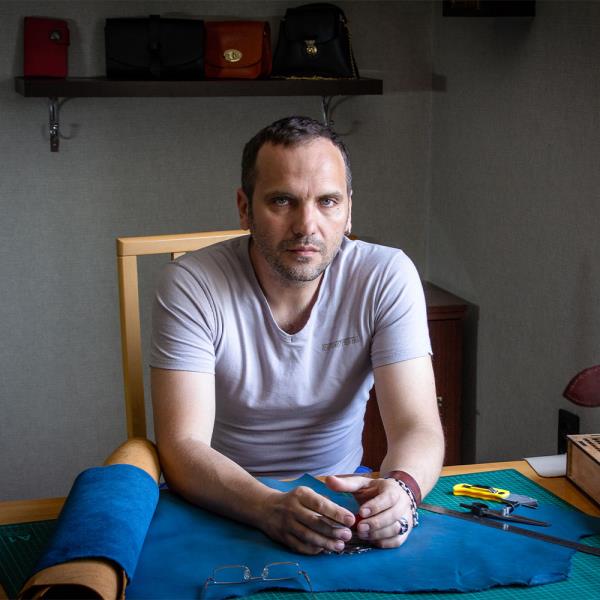 For over ten years, Dmitry Biryukov owned and managed a brewery, but the economic downturn affected his business and he needed a new direction. When he started thinking about alternatives, he turned to what he’s always loved: applied arts and crafts. From an early age, Dmitry’s hobbies were basket weaving, wood carving and even furniture making. He always wanted to try leatherworking. In 2016, he came across a leather scabbard making tutorial. He purchased his first piece of vegetable-tanned leather and a basic toolkit and started making cut-outs and sewing. He hasn’t stopped since. In 2017, he set up his own studio and he still keeps expanding his working place. The first object he made was a scabbard with a stamped pattern of flowers and butterflies.