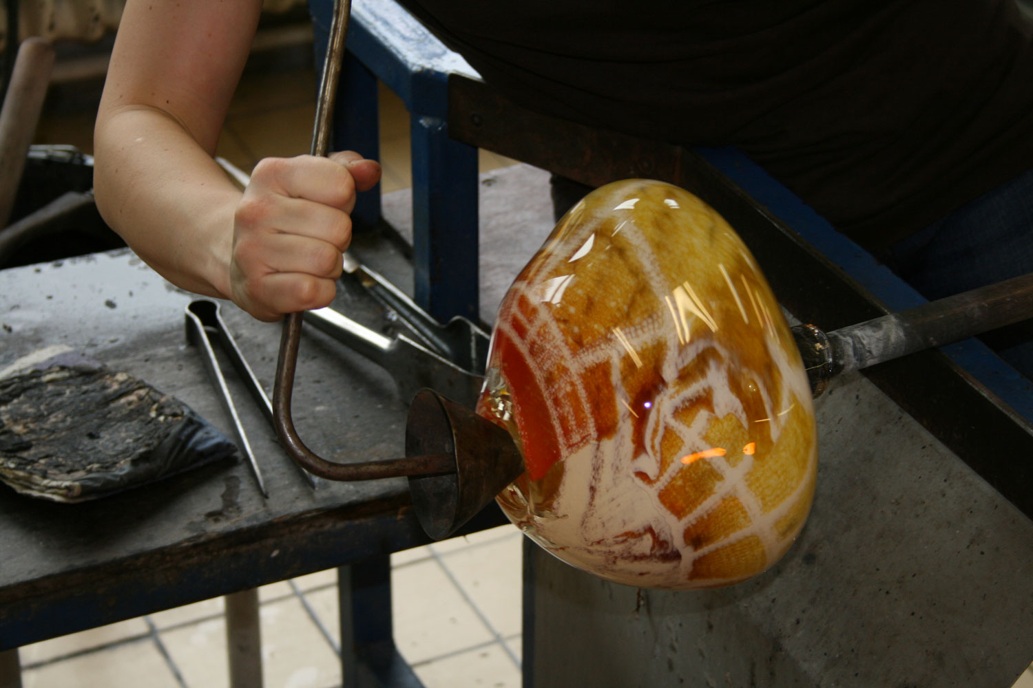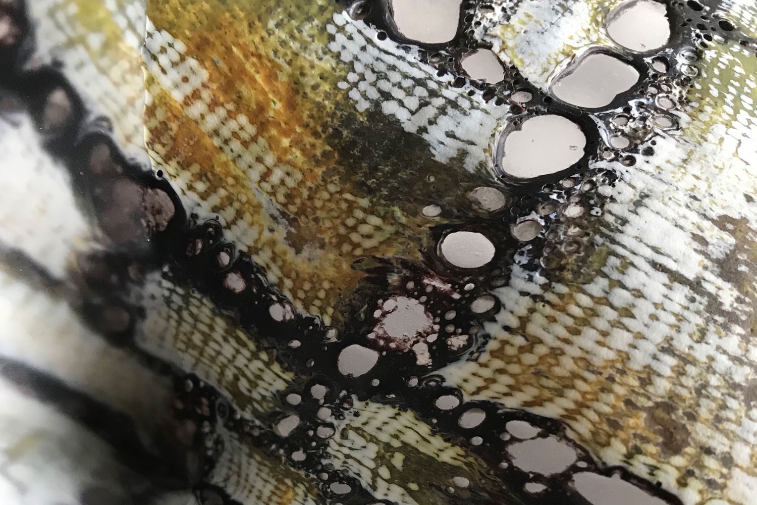 As Elinor Andersson is a traditionally trained glassblower, one might think that the artist would be making mainly traditional glassware, but far from it. Inspired by nature, textures and different structures of textiles, Elinor combines traditional glass making techniques and materials with contemporary computer technologies, creating objects that easily plays tricks with the mind of the observer. With education and work experiences from Bornholm, Denmark, Kosta, Sweden and RCA, London, UK, she is familiar with the international craft scene, which she entered in 2007. Elinor's method is to alter personal drawings digitally, print them on vinyl and mount them on a fine mesh fixed onto screen-printing frames. After that she sifts powdered glass colours through the mesh before putting it into a kiln. The result is a three millimetre thin sheet of glass; paperglass.