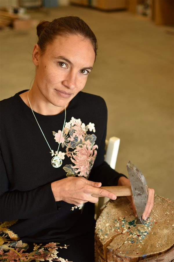 Feeling a desire to create, Eloïse Baro began to learn the ancient art of mosaic making by herself. She then gained valuable knowledge at the prestigious Spilimbergo Mosaic School in Italy. Studying Roman, Byzantine and architectural mosaic techniques, she acquired expertise that allowed her to develop her own practice with a contemporary vision. Alongside her restoration work on heritage sites, Eloïse experiments by upcycling, using all kinds of discarded materials in her mosaics. One of her notable projects was the interior and exterior covering of a 1941 Ford in New York.