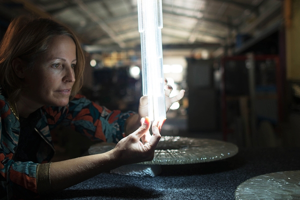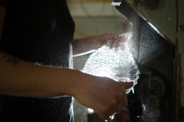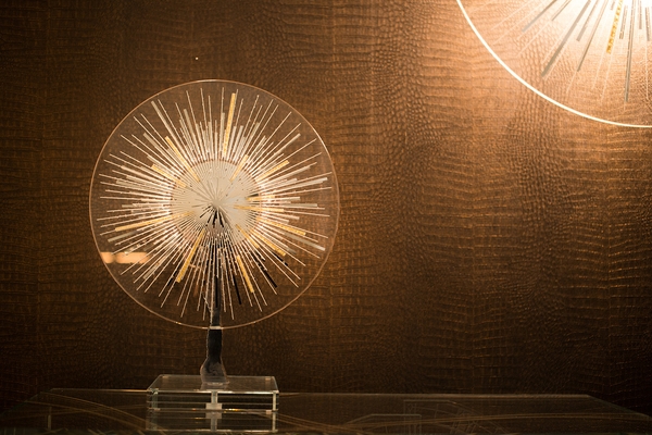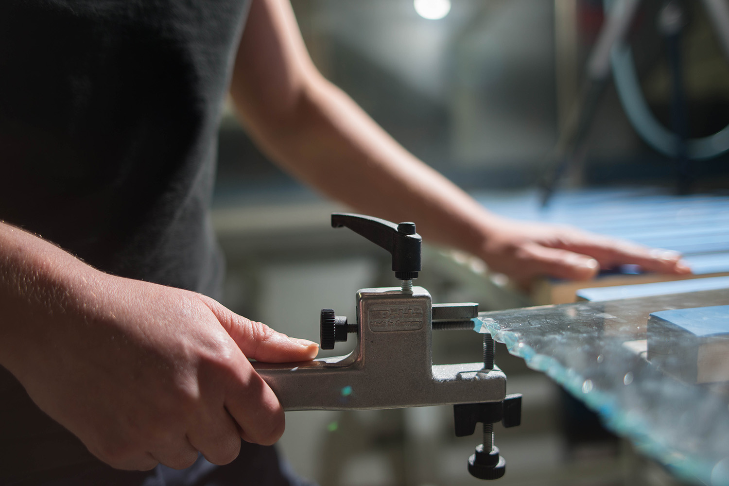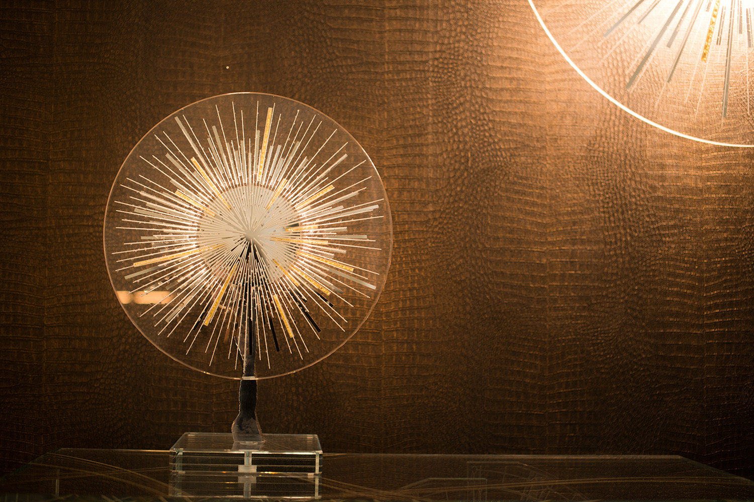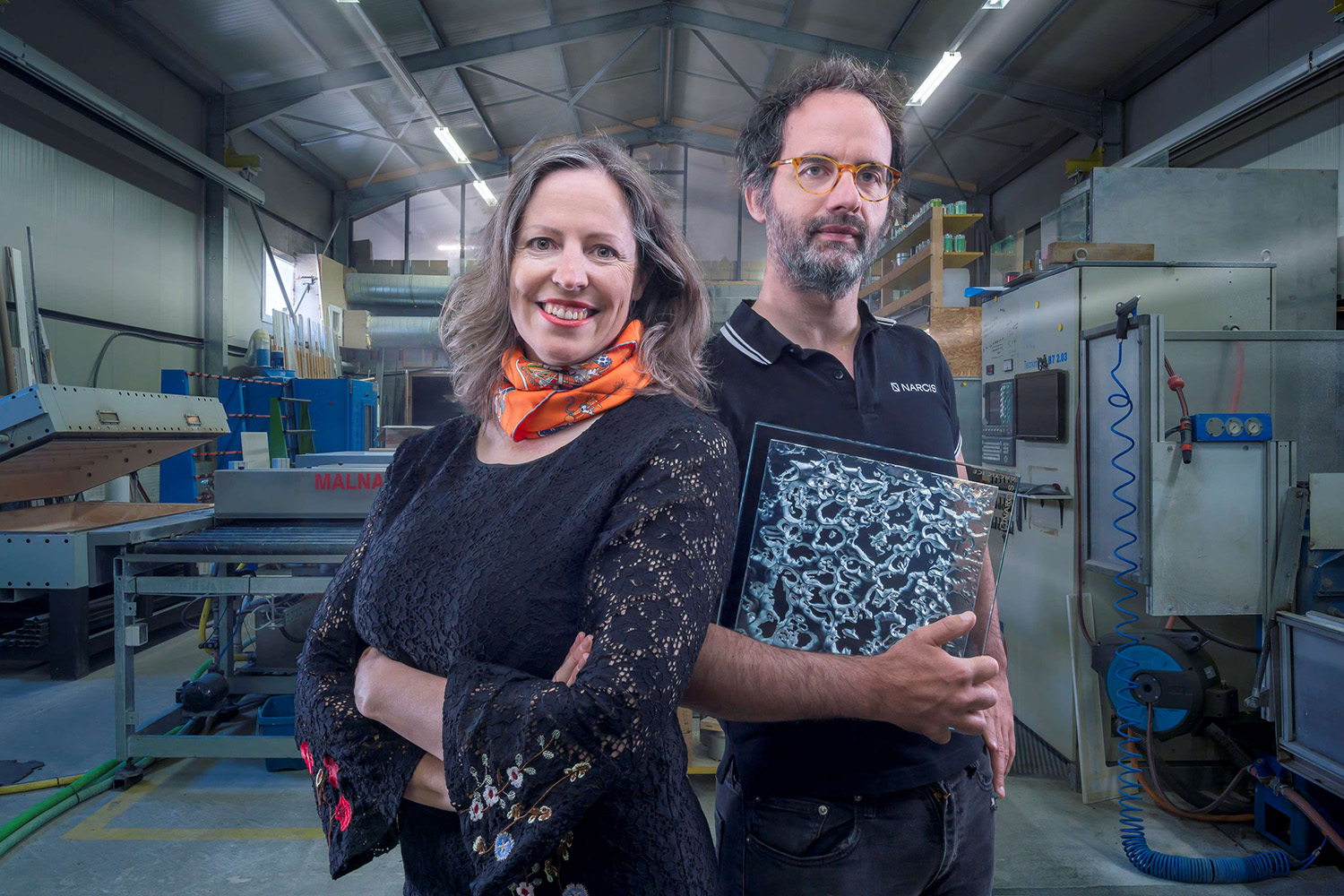 Diego Micheloud and Emanuelle Zufferey both studied architecture before exploring the world of stained glass through a close collaboration with the Swiss School of Stained Glass and Design. The profession came naturally to this self-taught duo, who opened their workshop in 2012. They specialise in all aspects of glasswork, from engraving and varnishing to enamelling and crystal moulding. Constantly pushing the boundaries of their craft to meet the needs of their customers, Emanuelle and Diego combine traditional techniques with modern technologies to create contemporary designs with new material effects. Each request pushes them forward and forces them to perfect their know-how in order to create distinctive glass works, inspired by nature and Art Deco architecture.