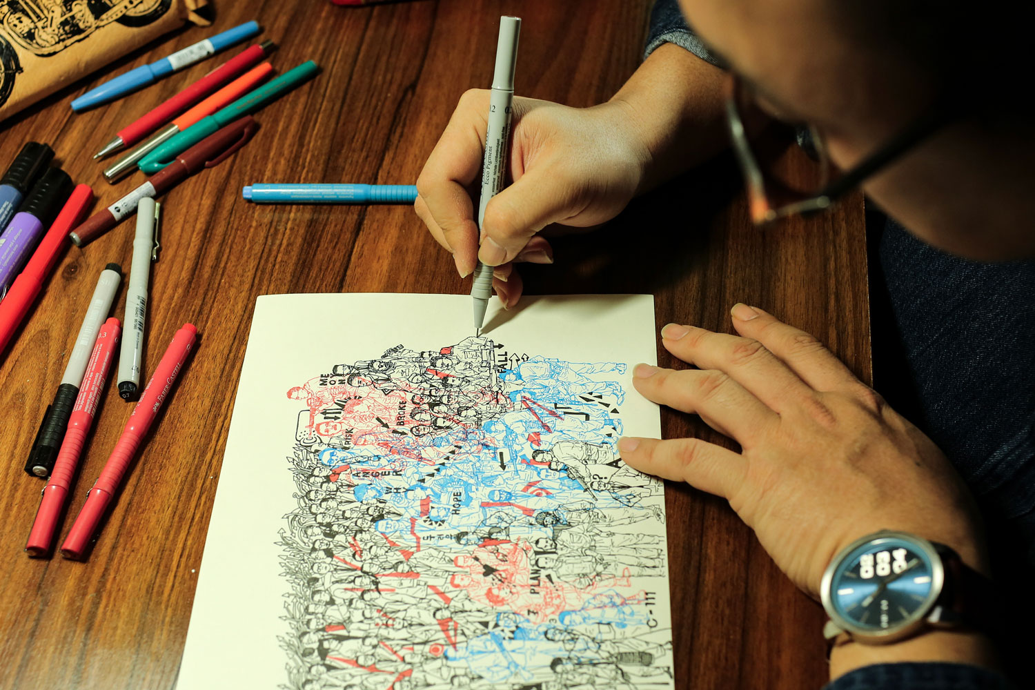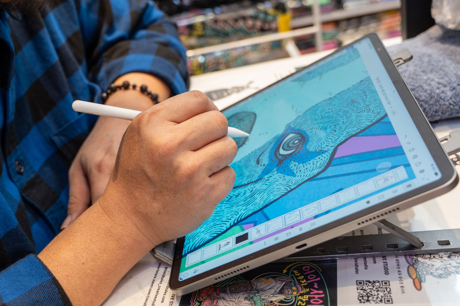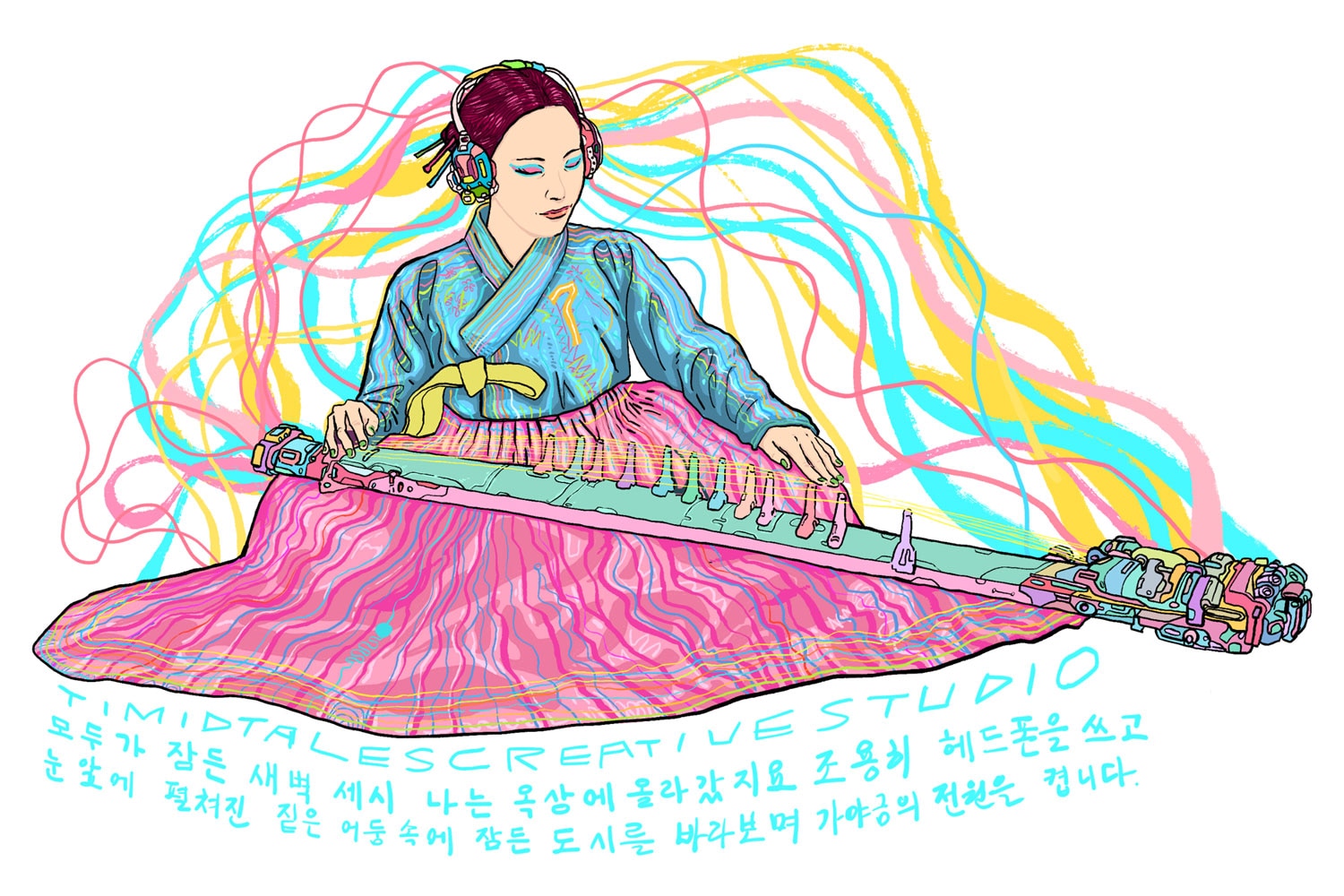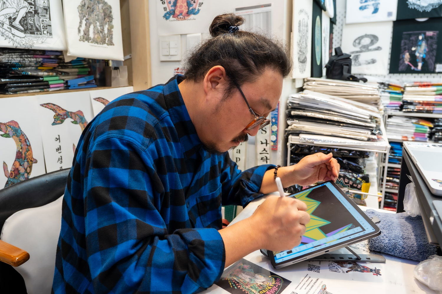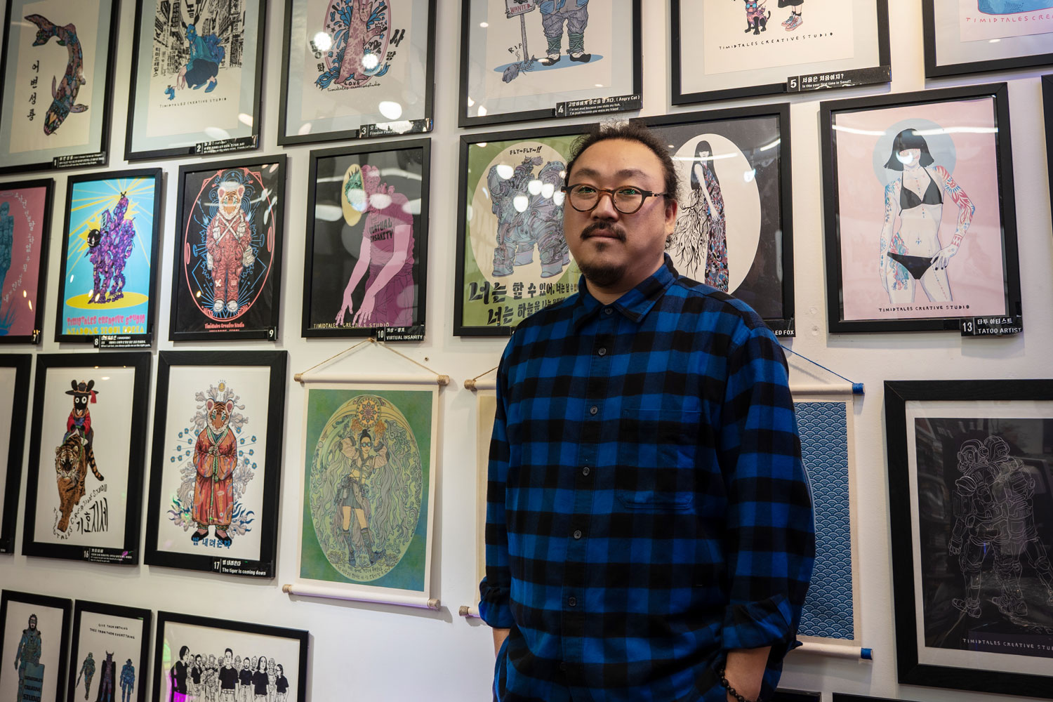 After many years of working in exports for a steel company, Kunil Chae adopted the name Enola Ton, his artistic alter ego, in 2018. “I needed to earn a living, but working just for money had become frustrating,” he recalls. This pushed Enola to go back to his true passion, illustration. Even though he had never studied the craft formally, he learned it on his own by drawing tirelessly since childhood. Soon, Timidtales creative studio and shop, based in a lively area of Seoul, Insadong, was born in collaboration with fashion designer Lea Kim. Together, Enola and Lea produce clothing items that feature his own elaborated illustrations. “When we study our products, my drawings always come first," he explains. “They are our primary focus and ultimate goal."