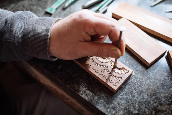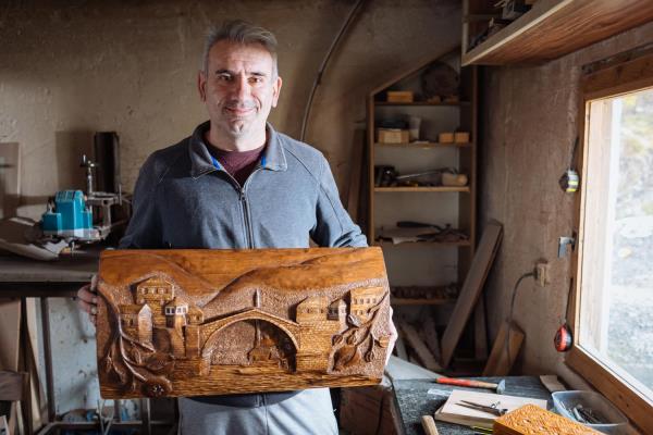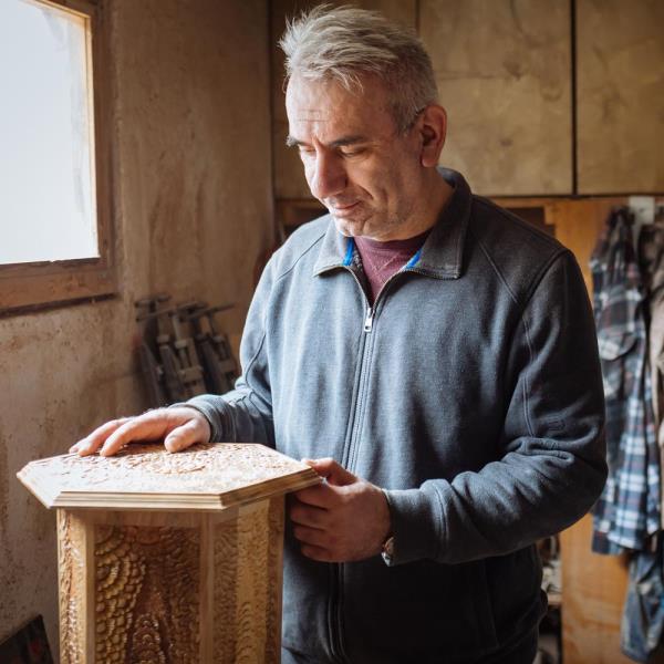 Konjic is a small town south of the capital Sarajevo where a specific, old-style Bosnian technique of woodcarving is practiced. The technique is so unique that it is inscribed on the UNESCO List of Intangible Cultural Heritage. Ermin Ljevo is one of the woodcarvers pepertuating this rare technique. With his skilful hands and attentive eyes, Ermin decorated numerous wooden objects with traditional Konjic patterns and contributed to the popularization of the artistic woodcarving craft through the companies he worked for as a carpenter, but also by making unique pieces of furniture or souvenirs that ended up in the homes of his customers from Bosnia and Herzegovina and the whole world.