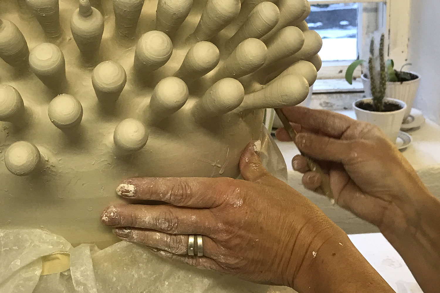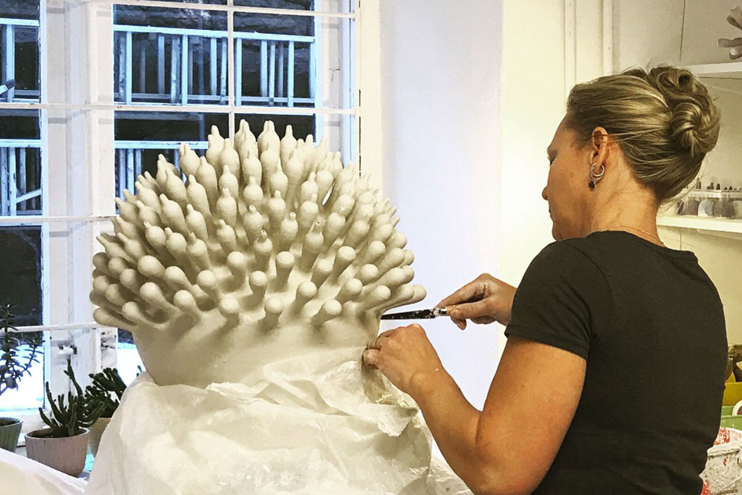 Eva Zethraeus grew up first in England and later in Madrid, Spain. When she first visited the Prado Museum at the age of 11, she was completely taken by Hieronymous Bosch’s painting El Jardin de las Delicias, an inspiration ever since. “At first I started painting and drawing, but during courses in Sweden I tried ceramics, and continued to work with the technique," she says. She then studied ceramics at the College of Applied Arts and Crafts in Gothenburg, and three-dimensional work has been her main professional focus since then. “I work with porcelain and make my sculptures by throwing on the wheel, then altering and assembling many parts to make larger, more complicated pieces.”