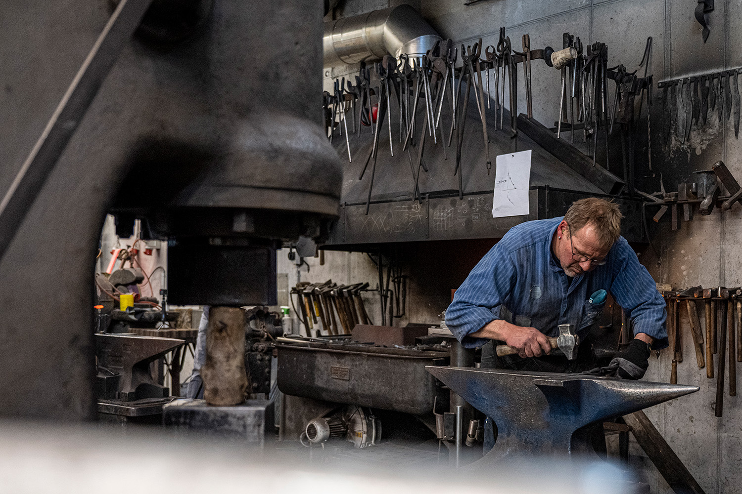 Although the atelier is most well-known for its traditional knives, Thomas and his team are passionate about designing and producing a wide variety of metal works, from shoe scraper irons to stairs, frying pans, and doors. As well as creating original pieces, Fuschina da Guarda also specialises in restoration and reconstruction work. Thomas believes that innovative continuity means maintaining tried-and-tested techniques on the one hand, and tirelessly developing them further for new conditions and requirements on the other.