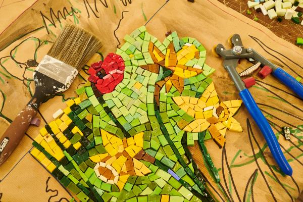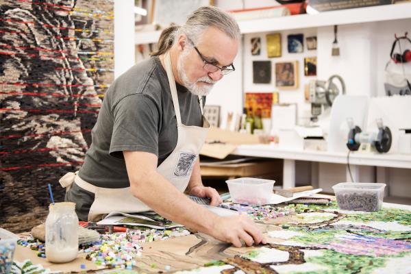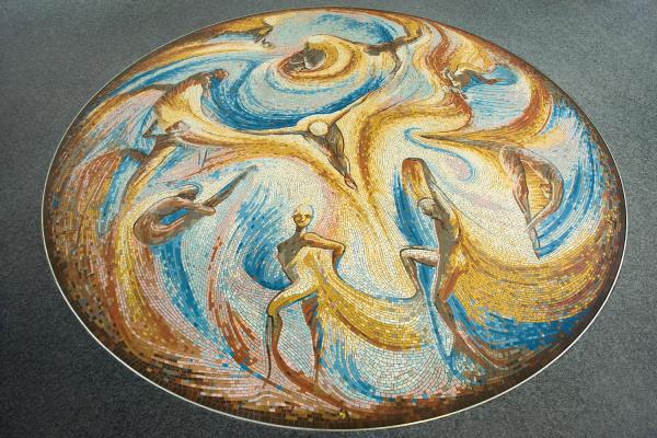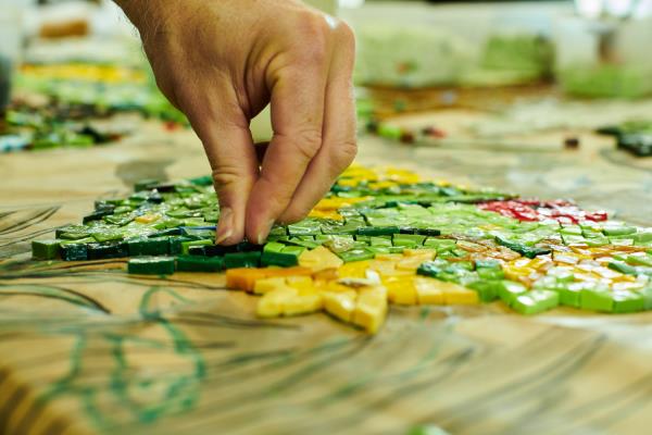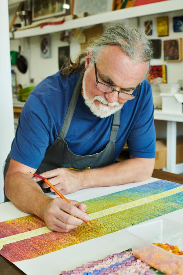 For 30 years, Gary Drostle has specialised in making large-scale mosaic artworks, on commission. With each piece he tries to combine the clients’ wishes with a sense of place, and each work is designed to harmonise with and reflect the specific site. “I look at all aspects of the site” he explains. “The architecture, the landscape, the history and heritage of the location and of course the client themselves. In this way each work is specifically connected to the location where it is sited. Moreover my designs are heavily influenced by my own experience as a craftsman and artist based in London from a working class neighbourhood, where I still live. I think the nature of London as a world city, a melting pot of cultures from around the world and my interest in the history of working people all feeds into my designs.”