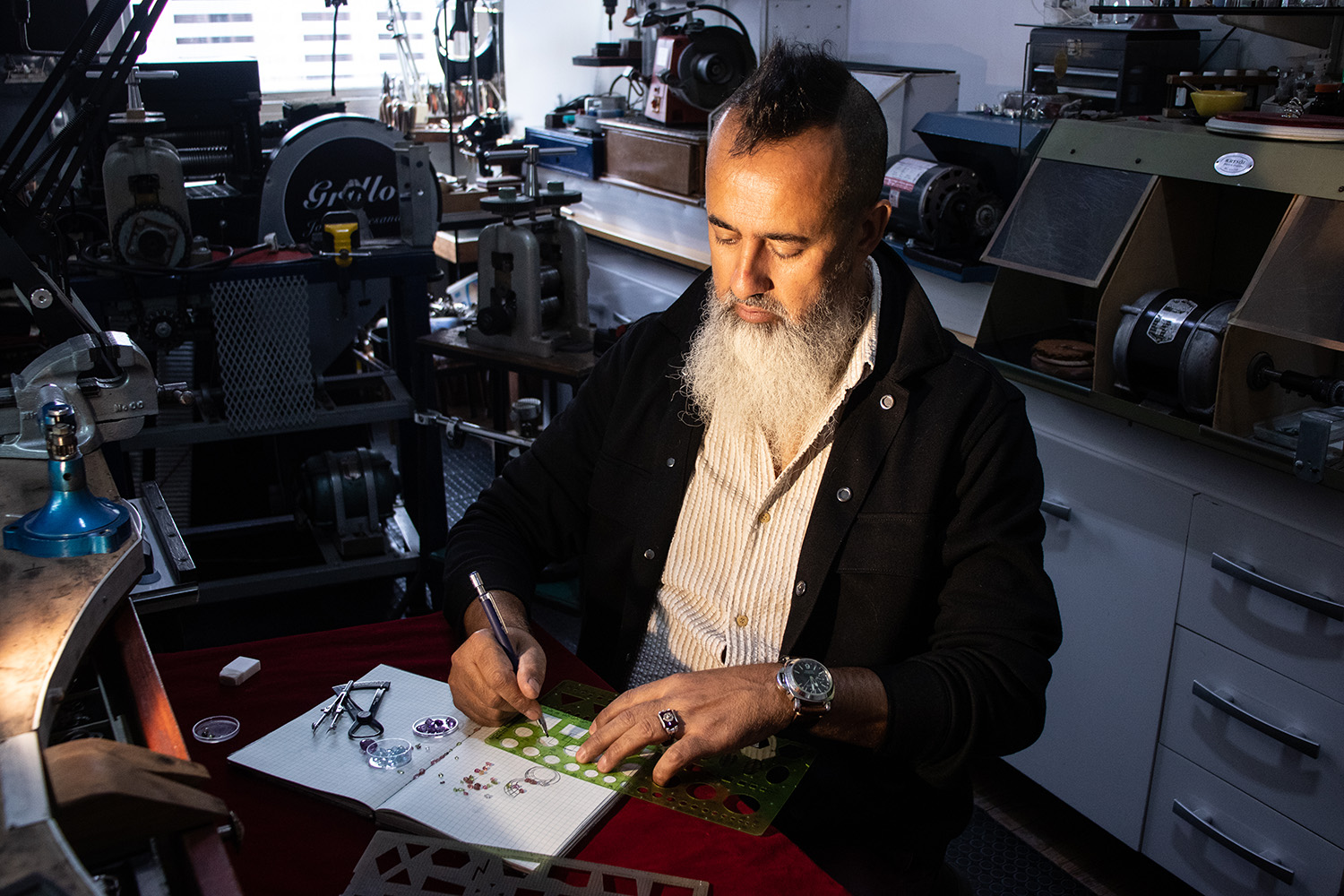 Since 2001 and for nine years Pablo Grillo was part of a theatre company that travelled to different parts of Asia, Europe and Latin America. He took advantage of these stays to study jewellery and learn the making process from workshops. This allowed him to discover Persian jewellery in Isfahan in Iran, goldsmithing and damascus techniques in Toledo in Spain and indigenous Mapuche jewellery in Chile. Today, Pablo incorporates all these learnings into the design and creation of his pieces. "I think the craft chose me, because from a very young age creativity and manual skills allowed me to assemble and disassemble toys, as well as explore the world and transform objects," says Pablo. "Today, the freedom I feel in expressing my art through goldsmithing keeps intact the restlessness of those first times I created objects with my hands."