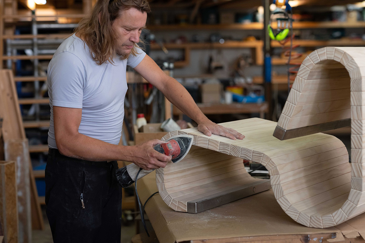 Problem-solving and innovation are key words in the design ethic of furniture maker Hans Endendijk. Born into a family of designers, artists and art lovers, Hans had the genetic blueprint for becoming a designer and maker. Raised with the idea that everything can be understood by dismantling and reassembling objects and machines, the way was paved for him to become a furniture maker. Hans was apprenticed to a master for three years, and produced furniture for luxury interiors, including for a private yacht. The first piece he made was a coffee table with curved shapes brought together with coloured wood glue. Hans is well-known for using wood, metal, synthetic materials, electronics, digital imaging, photography, and 3D printing techniques.