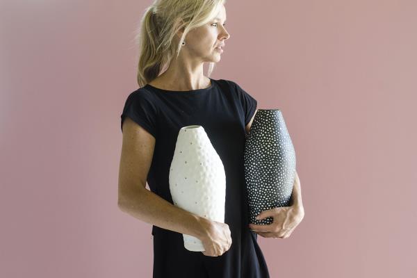 "As a lawyer, you mainly work with your head. However, I was missing a sense of passion," says Dutch artist and ceramicist Jacqueline Harberink. She rediscovered her passion by first attending an evening course in ceramics in Milan, then slowly building up her knowledge by enrolling in further courses in Escuela de Ceramica de Moncloa, Madrid. She deepened her skills by attending specific workshops, learning from Luca Tripaldi and Martha Pachon Rodriguez. Her obsession with difficult techniques is clearly reflected in her use of the laborious 14th century Chinese rice grain technique and the shellac technique. She hones her style with hints of the Amsterdamse School aesthetic and natural organic forms, while adding a modern twist.