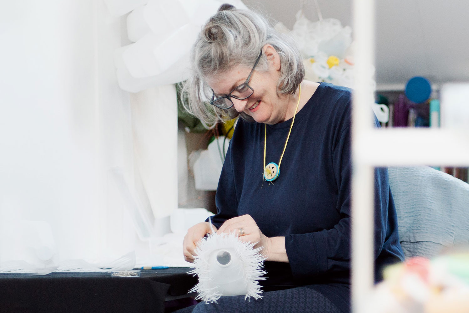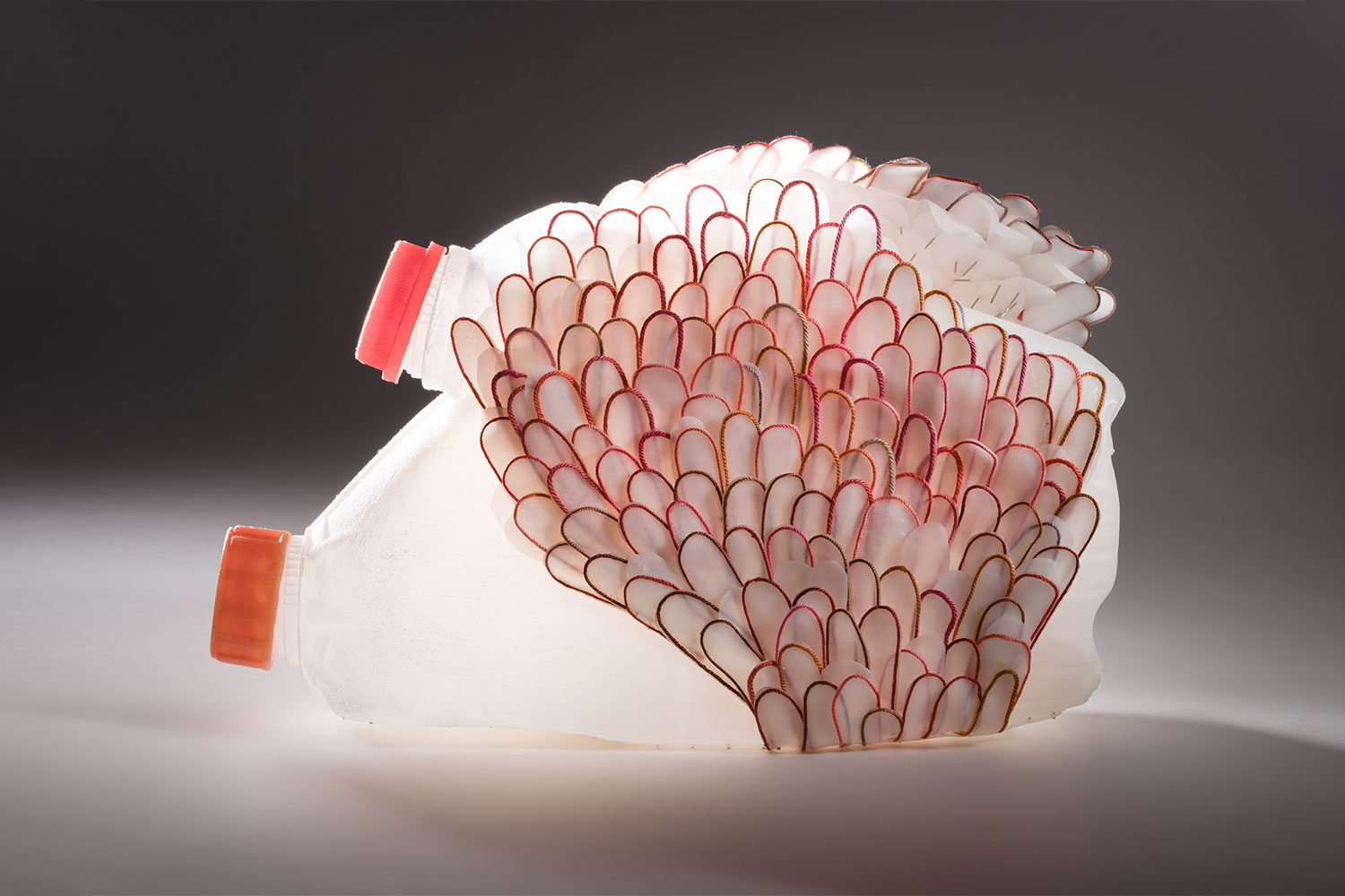 Helen O’Shea trained as a textile artist but became increasingly aware of the need to look to alternative materials. She creates delicate futuristic creatures from waste plastics. Her forms are drawn from deep water hydrothermal vents. Through her practice, Helen researches what is happening in our oceans. “We know more about the moon than we know about the deep oceans, so new information about plastics within that environment is being published frequently.” Her works are both stunning pieces of art and calls to become more conscious of our impact on the Earth. The found plastics Helen uses had another life before becoming part of the work, this legacy offers another layer to the finished pieces.