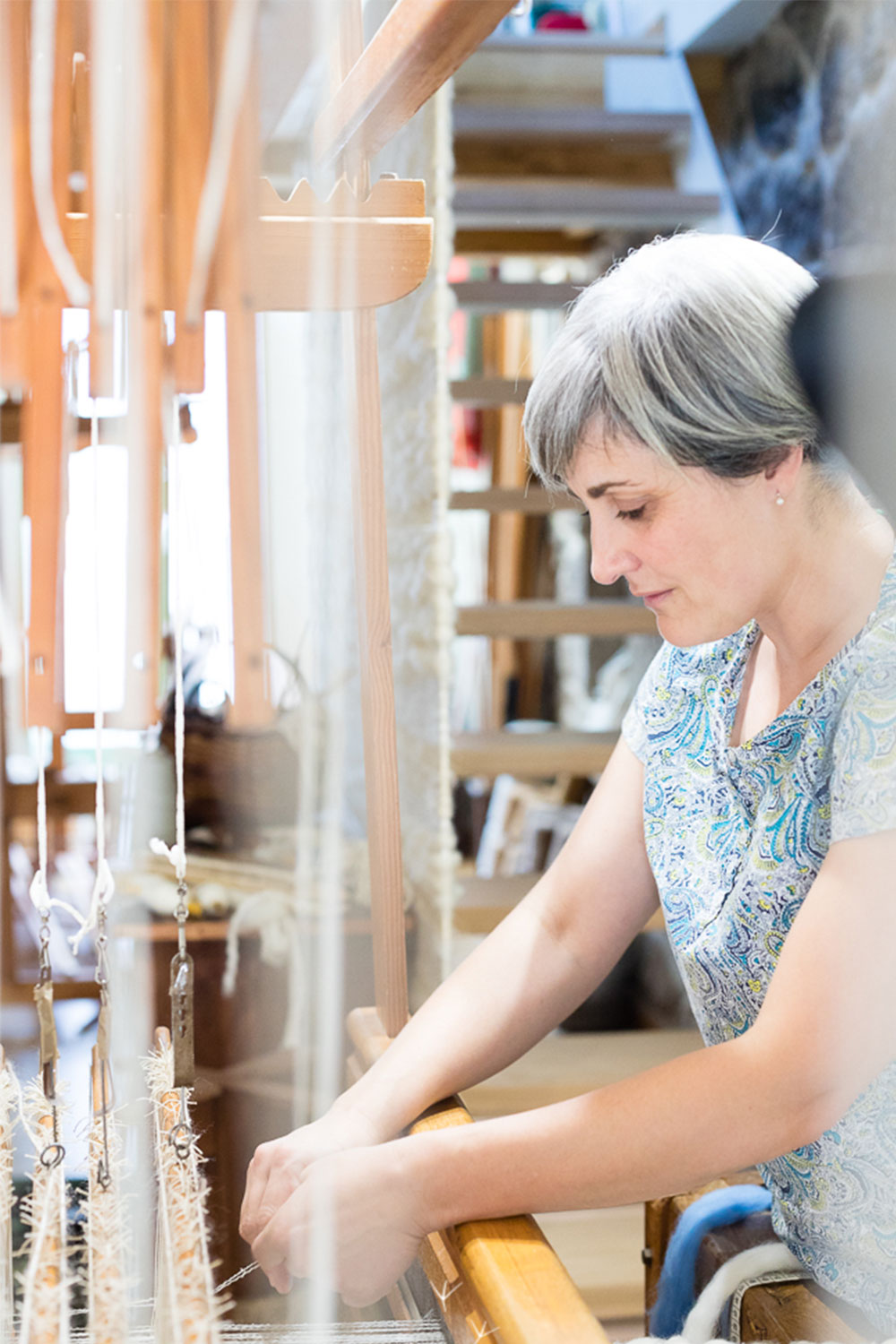 From a tiny rural village in Galicia, Inés Rodríguez weaves by hand with tireless passion and ingenuity. Her approach to textiles is nurtured both by research on innovative materials and an artistic eye, combining the craft with elements handpicked from other disciplines such as design, architecture and painting. She designs and executes, working mainly on her own, choosing colours and dyeing threads, making only one piece per style. Inés collects old tools and textiles and likes to listen and learn from weavers of the past, keepers of memories. The extensive knowledge of traditional Spanish and Galician techniques such as rosepath and block designs among others and her collaborations with the fashion industry, make her work and research unique.