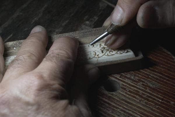 Born in 1939, Master Teimuraz Jalaghania has been practising the craft of Damascening for more than 35 years. Following his great interest in weapons, he began collecting and restoring antique Caucasian weapons since childhood. “I’ve been fascinated with this craft since early childhood. As kids, we used to play war games at the Narikala Fortress in Old Tbilisi with homemade wooden guns. I enjoyed tinkering, and this is how I gradually moved from wood to metal.” Later, he met Master Guram Gabashvili, who revitalised the tradition of Damascening in Georgia. Working as his apprentice for some time, Teimuraz became a skilful Master of gold and silver inlay. Today, in his workshop, located at the spectacular Old Bath district in Tbilisi, he teaches his apprentices, in order to ensure the transmission of this precious tradition to future generations.