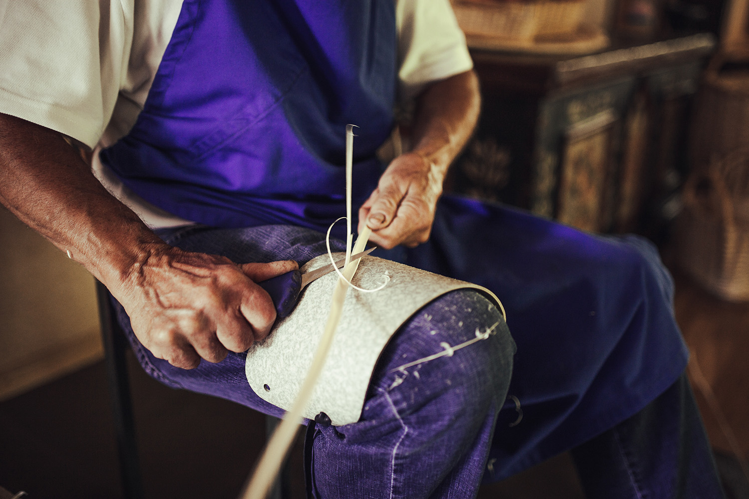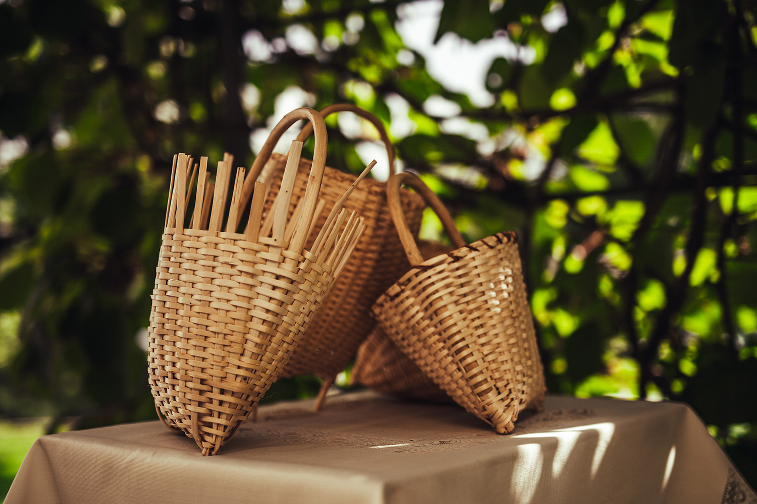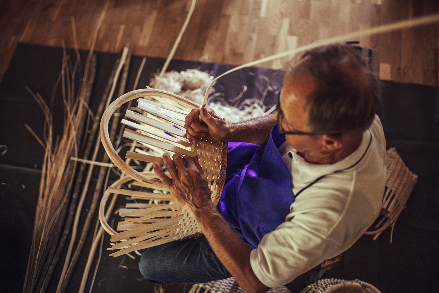 In his workshop in Preddvor, Janez Krišelj meticulously weaves an array of different wicker products, from baskets to wicker bowls. By employing thin strips of hazel branches (vitra in Slovenian) and exclusively finishing his products with spruce root, he adheres to the highest standards of tradition, eschewing artificial materials. Though he is over 80, Janez exudes the vitality of a lifelong athlete, engaging in cycling and hiking. On his outings he always keeps his eyes wide open for the right kind of hazel branches. Eager to share his extensive craftsmanship, he connected with The Arts & Crafts Centre of Škofja Loka in 2015, where he now regularly conducts workshops. Janez also holds presentations at primary and secondary schools and finds immense joy in passing on his legacy.