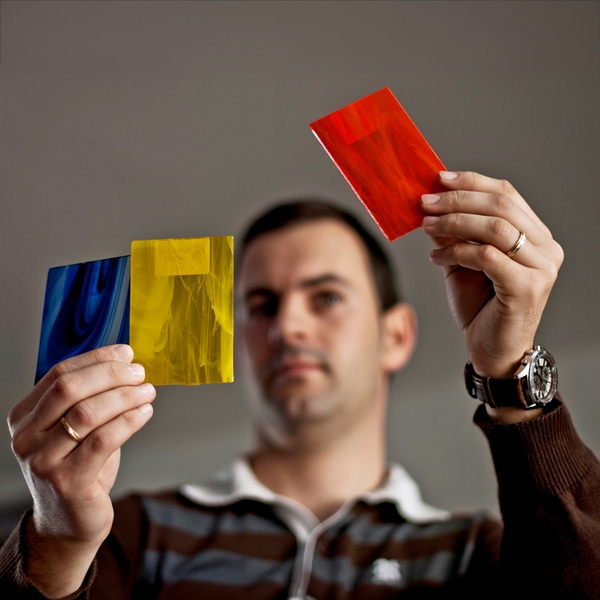 A self-taught stained glass artist from the age of 14, Jonatan Díaz also benefited from his association with the renowned Flemish teacher Rudy Bellemans to learn this ancient craft. In 2000, shortly after his 18th birthday, he opened his first studio, Vitromar, to create stained glass windows inspired by classical and contemporary architecture, art and design. Jonatan later innovated with his sculptural glass kaleidoscopes under the name Reflektium, using the same coloured materials as for stained glass windows. In his kaleidoscopes he also applied parameters that mirror those used in space telescopes. One of his works, Anemone Ignis, was awarded the prize for the most singular work of craftsmanship of the year 2022 by the regional government of Andalusia. Visitors to Jonatan's workshop are not only struck by the modern appeal of his stained glass, but also experience a profound sense of infinity when looking into his unique kaleidoscopes.