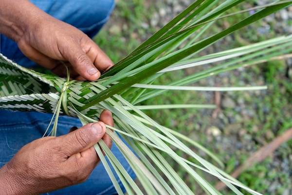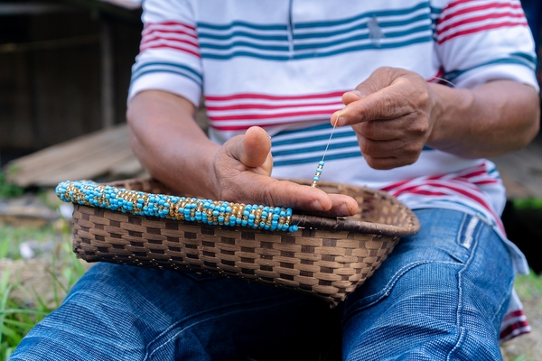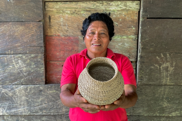The art of weaving baskets is common among Colombian artisanal communities. Jorgelina Dumasá makes her baskets with colourful beads as decorative elements. These reflect the colours of the Chocoan landscapes and the Colombian folk motifs. Jorgelina learned this craft from her parents. She started creating her art pieces from a very young age, and today, she is a master artisan in basketry. Her pieces are woven from iraca palm, a biodegradable material that can be used as a fertilizer for the soil. This makes her processes and creations an eco-friendly way to earn a living and share her tradition with the world. Jorgelina’s baskets, in all sizes and shapes, can be used as decorative objects, but they can also serve as containers for multiple purposes. Jorgelina works with her husband Belarmino.