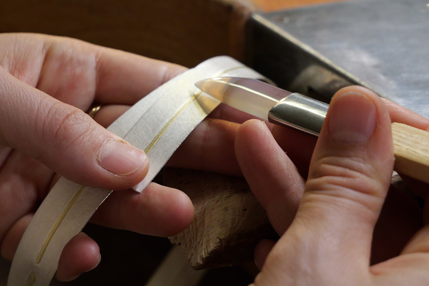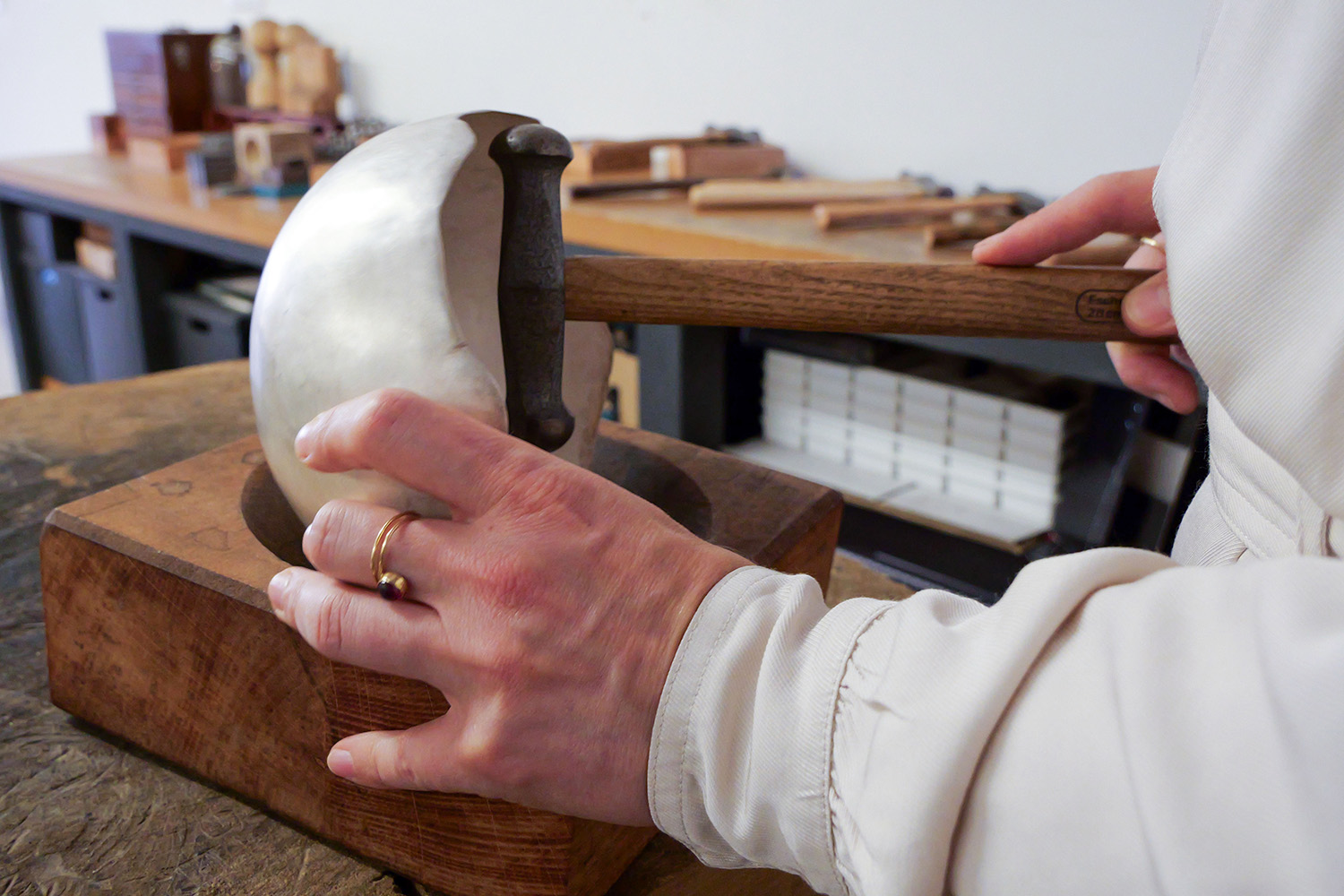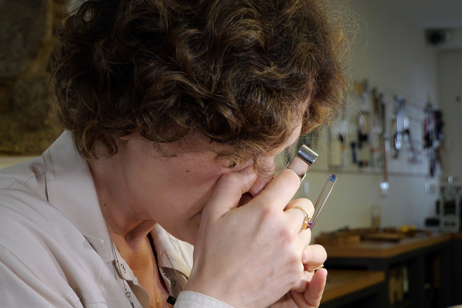 Josefa Castro met the founders of Noroeste Obradoiro, the Spanish master Antonio Ibáñez and his wife Marian Diéguez, when she was 16. She chose this profession, she says, because of her early fascination with one of Antonio's works. Josefa studied jewellery making at the Ontario School of Arts in Toronto and the Massana School in Barcelona. On her return to Santiago de Compostela, at the age of 26, Josefa began to exhibit her work in Noroeste and soon became a member of the studio. After Marian's death and Antonio's retirement, Josefa took up the baton from her mentors and continued to honour their legacy. She now owns and runs the atelier in Santiago, where she creates jewellery linked to Galicia's cultural identity and nature. Antonio, who still visits her workshop regularly, remains a reference point for her.