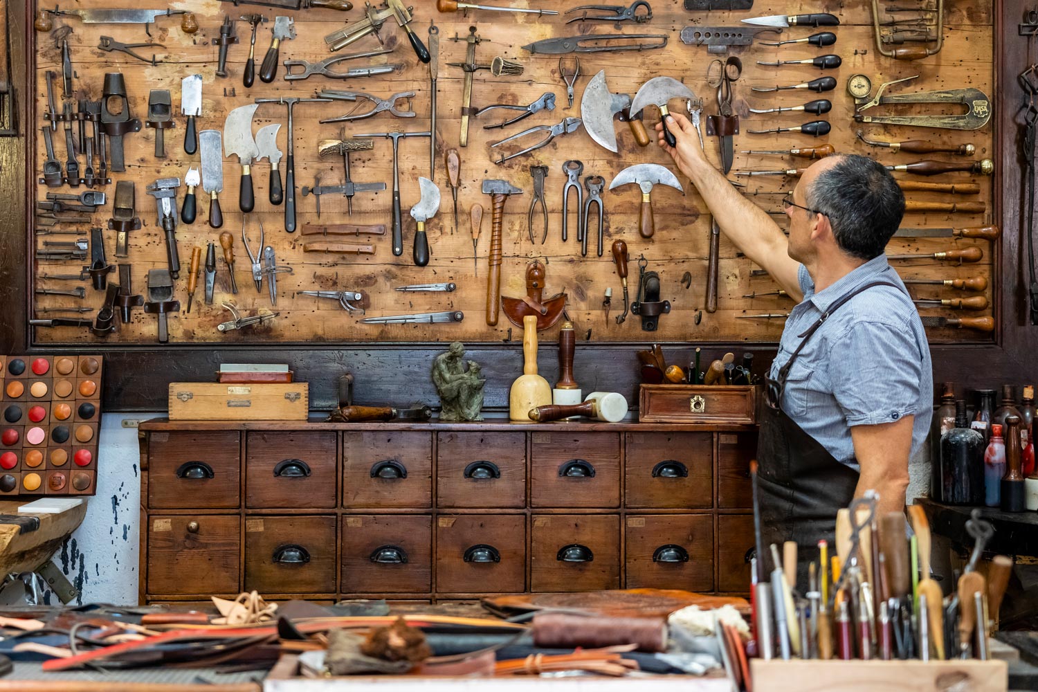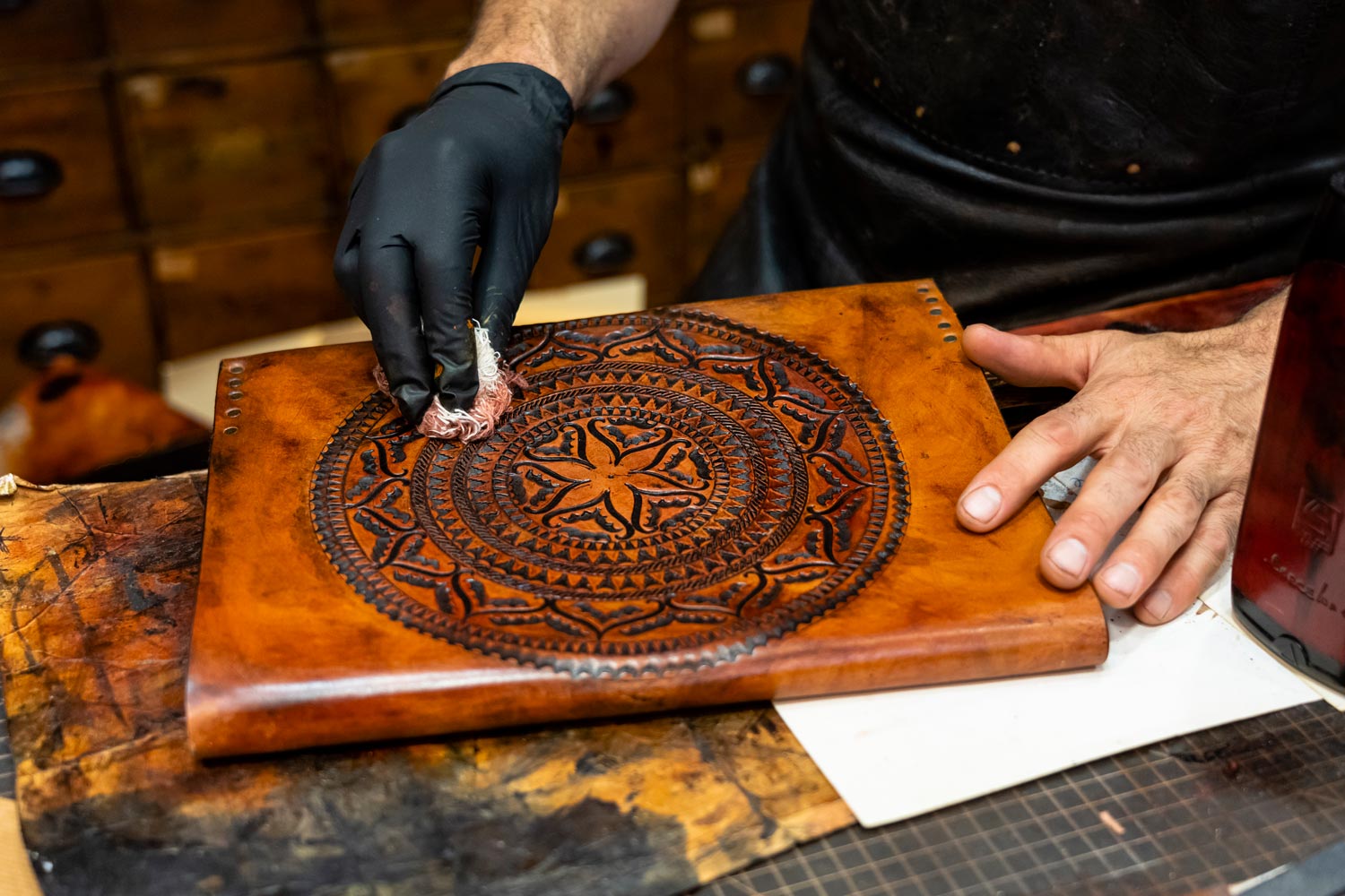 Julián Sañudo is the second generation of craftsmen in his family. When he was just 12 years old, his mother taught him to emboss Celtic knot designs on the bags she made. He found it challenging, but customers were delighted with his engravings and bought the bags. "At that moment, I saw that there was something magical, something special about this work. Something worth exploring," says Julian. His specialty is engraving with punch dies on vegetable-tanned cowhide leather. On leather surfaces, he expresses his imaginary universe that he transforms into paintings. In addition, he spends 60 percent of his time working on customised projects for different clients.